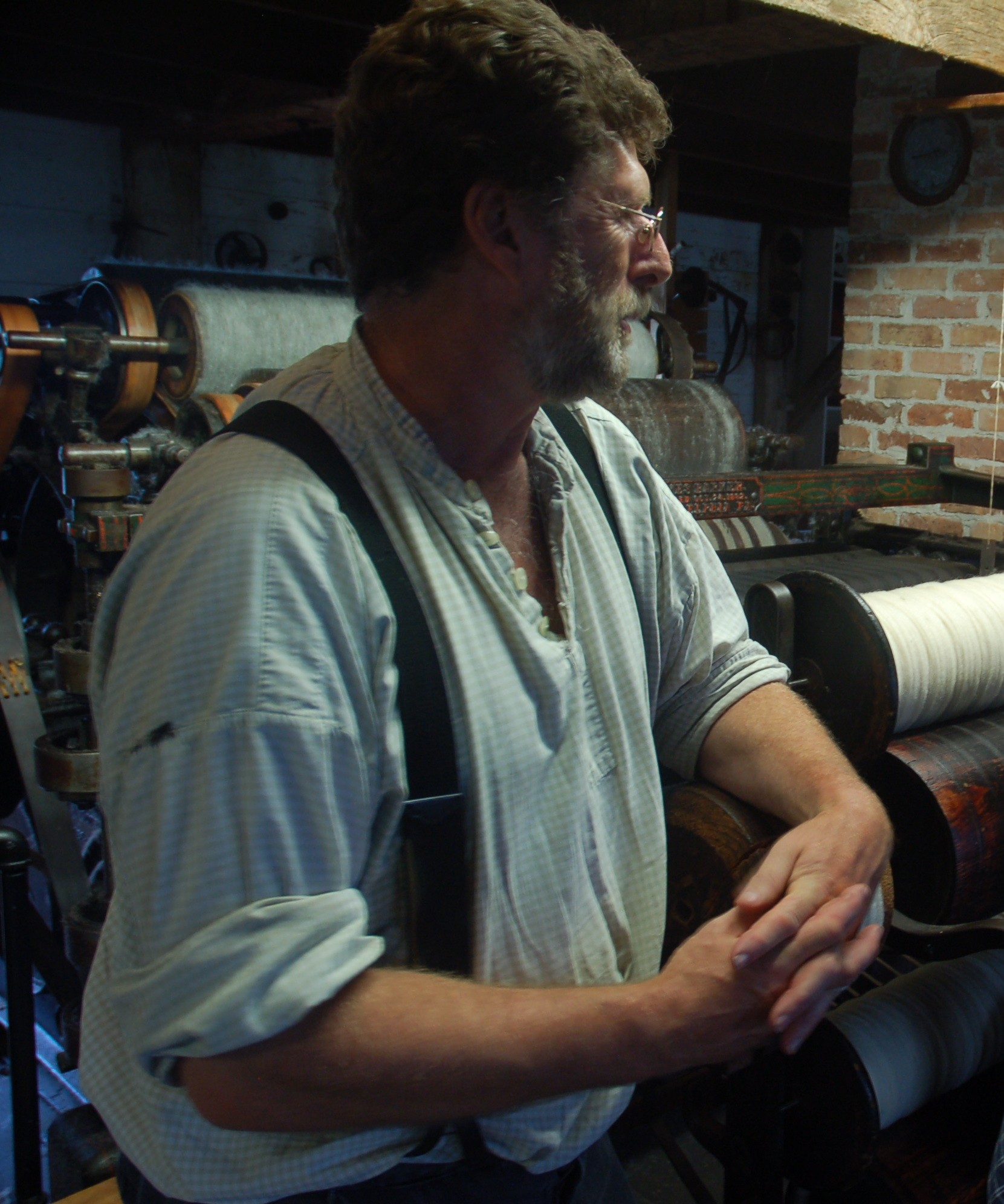 I work in the Asselstine Woollen Factory at Upper Canada Village. I have been working at the village for 7 years, and in the Woollen Mill for 4. We are a fully operational, water turbine driven woollen mill. We have all the machinery necessary to make blankets and knitting yarn. Our spinning jack and our set of 3 carding machines were manufactured in Massachusetts in 1867 and we also have a blanket loom from the 1840’s.