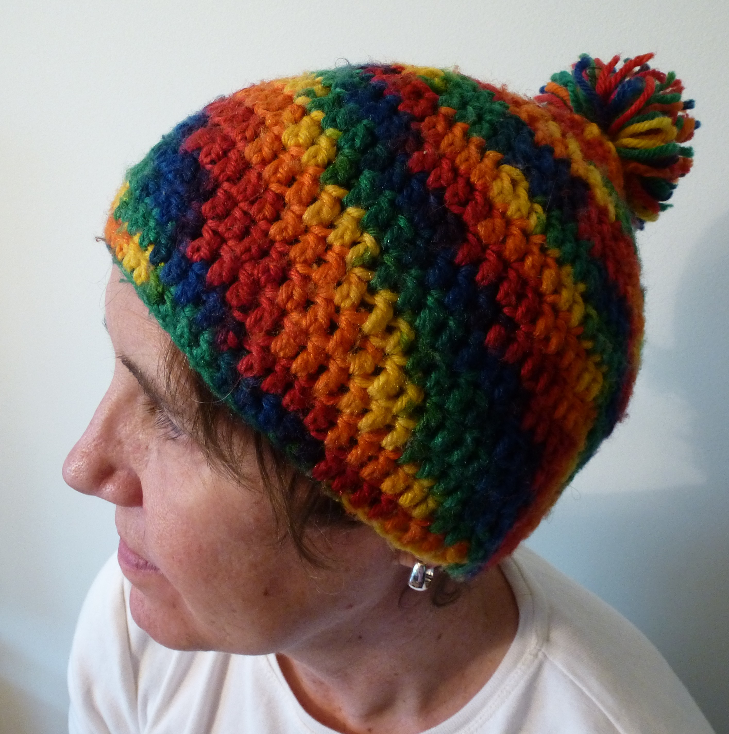 Although I make hats pretty much constantly, I often forget to wear them. People that know me well, know that I am pretty impervious to external temperature (the hot flashes I had a while ago notwithstanding). For this reason, I often don’t wear what I should in the winter. Last year, I was commuting to downtown Ottawa and had to pass a bit of a wind tunnel on my walk to the transitway to catch my bus. One day as I was holding my mittenless hands up to my frozen forehead, I realized how important the covering of the forehead and ears truly are at about 15 below and colder. Having said that, I have never much cared for the folded up brim on a knitted hat. They often go skew-whiff as my mother would say, especially if you change colour or pattern after the ribbing and want the fold to be exactly consistent.