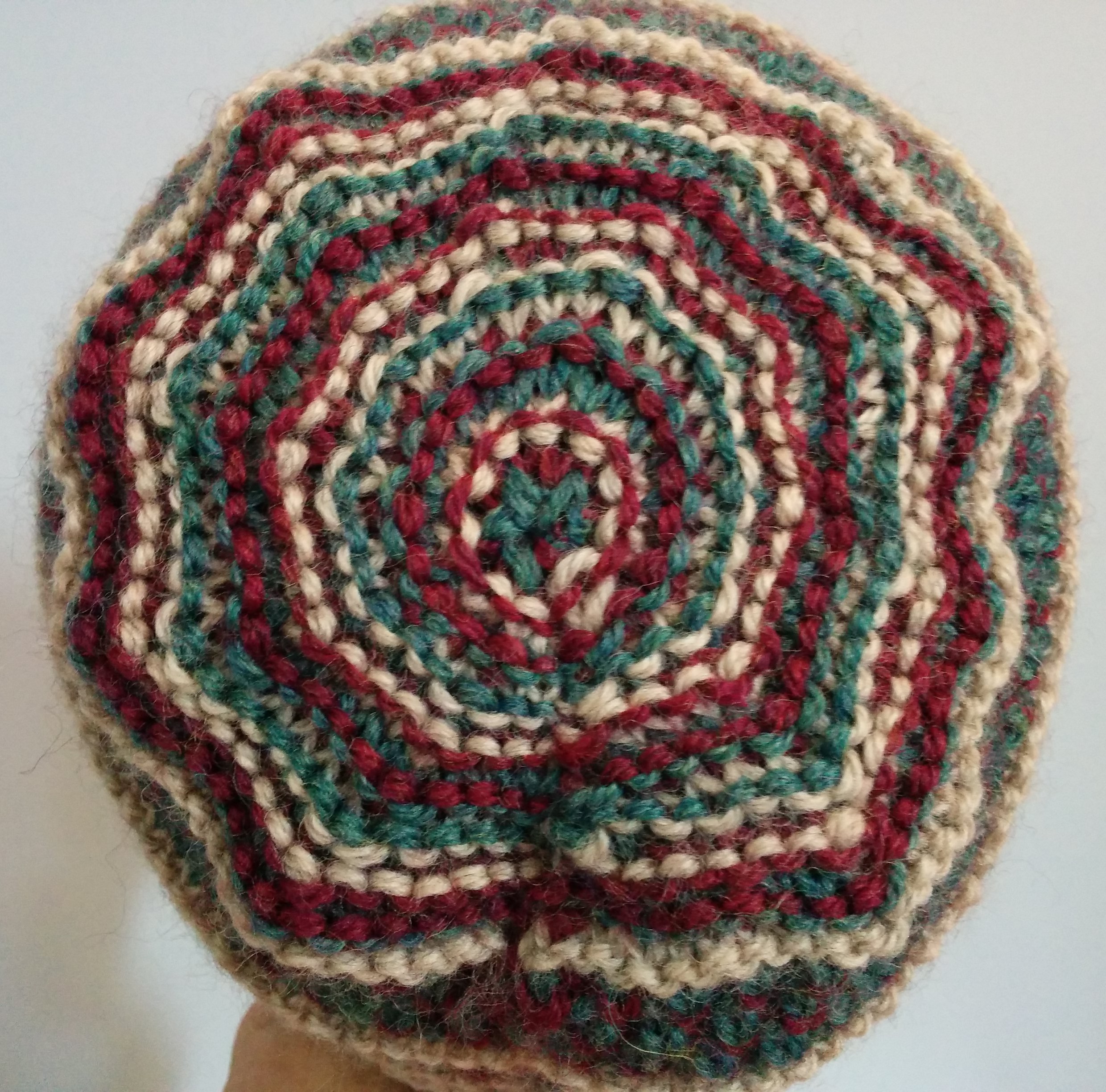 I did the top in just garter stitch, changing the colour after each row. I used 10 points of decrease and decreased with a purl two together at each on the purl rows (p8, p2tog, etc…). After the row that gave me 10 stitches left, I did the knit row, then did p2tog around and finished off. I actually quite like the effect, if I do say so myself.