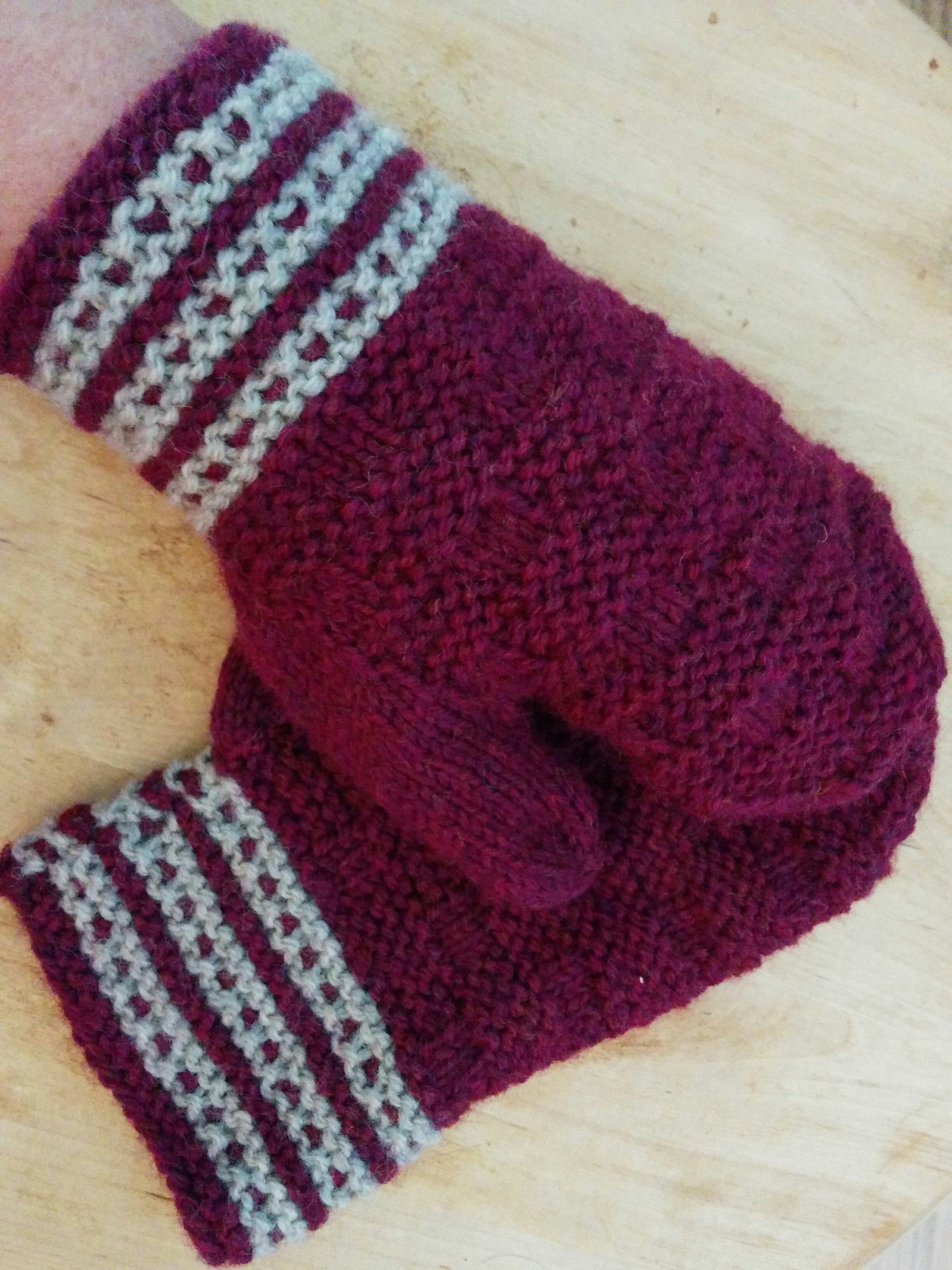 Heather does not like this post’s colours…to her they look like watered down Christmas, hence the name of the post. I was going to do these mittens with the cuff as is and the main part in the green. I made the mistake of asking her opinion in the car and got her honest answer, so I followed her advice and stayed with two colours. To do otherwise in front of her would have seemed rude. The stitches are Windowpane Stripes, pg 58 for the cuff and Little Check, pg 21 for the main part of the mitts. (The beige is not reading correctly in this photo…see the last two hats below for the actual colours)
