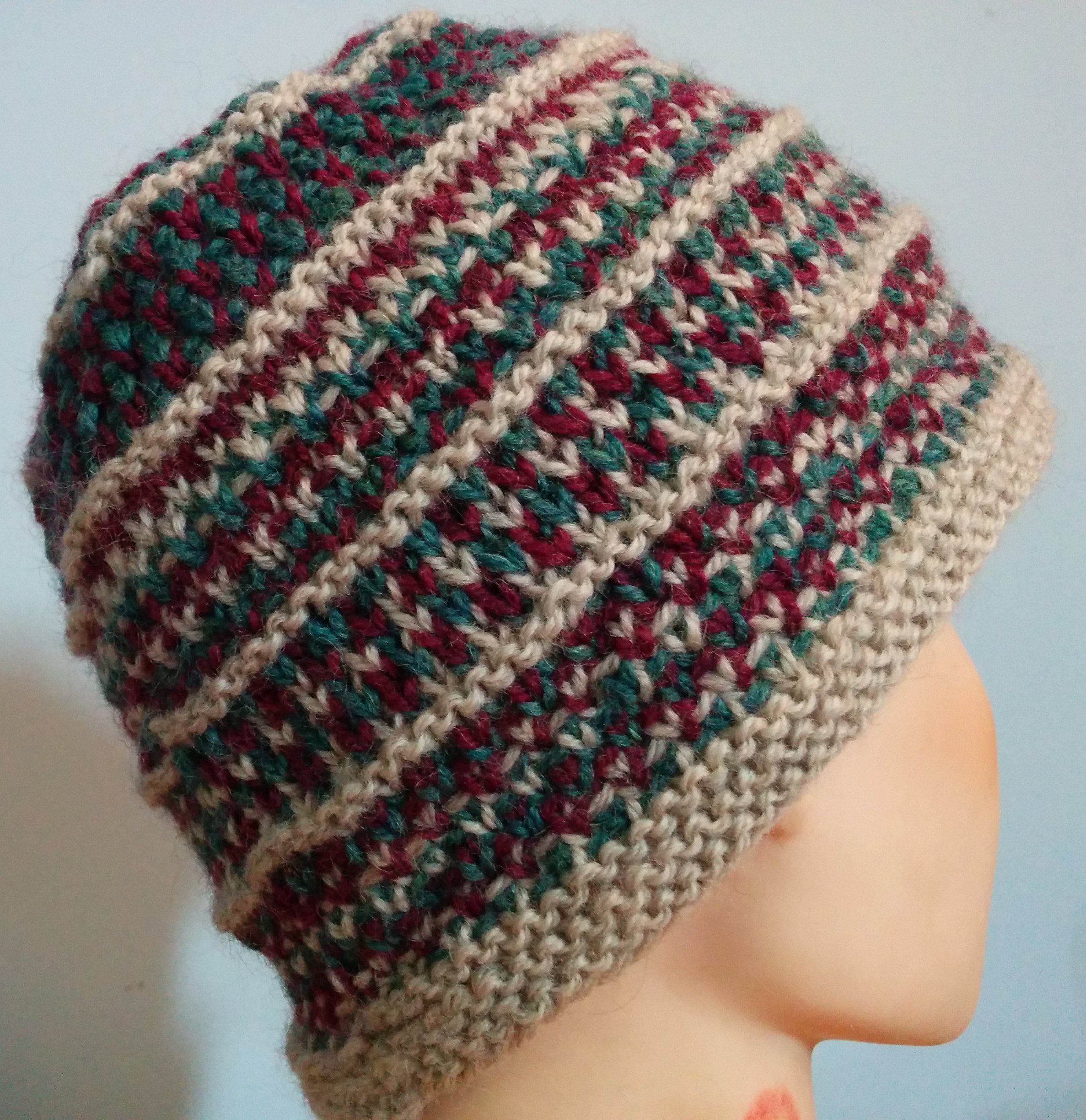 This is the last hat I am doing in this colourway, at least for now. It is a bit of a sampler again. I cast on 100 stitches with same needle and wool as before and did 6 rows of garter stitch before changing to Tricolor Stripe Pattern – woven version first for one repeat, then two rows of garter stitch and one repeat of the stranded version. After another two rows of garter stitch I did one repeat of Three Color Tweed, pg 61, then two rows of garter stitch and 12 rows of Semi Woven Tweed, pg 60.