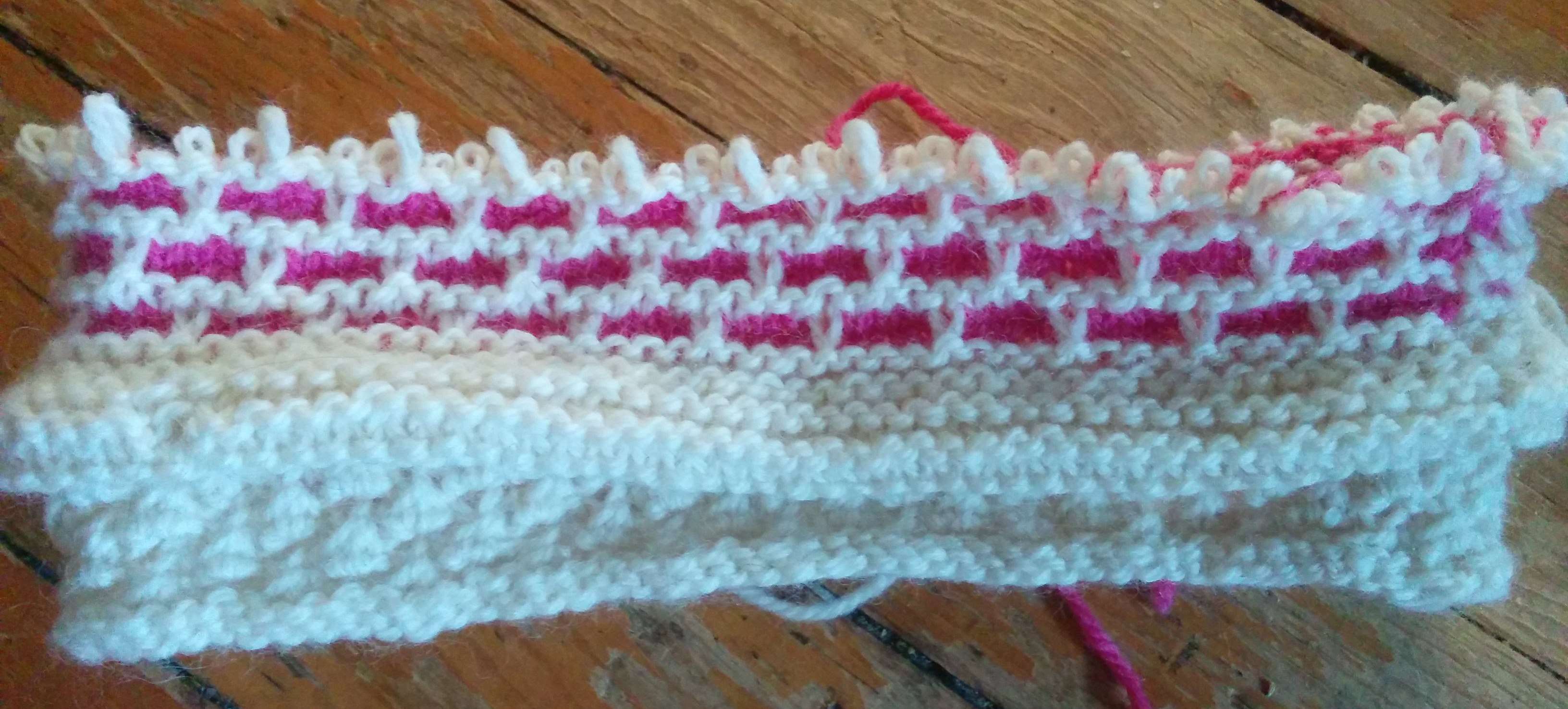 I cast on thinking I was going to be doing the Broken Plaid Pattern (pg 62) which is a repeat of 8, so I cast on 104 stitches. I had a concept in mind, which I will probably make soonish. As I was trying to set this up, I knitted the first row when I really should have purled and that got the bottom looking funny for what I had in mind, so I decided to put a patterny stitch below the colour work. To the Fancy Texture Pattern chapter I went and found the next stitch to be Trinity, Cluster or Bramble Stitch on page 129 (luckily a repeat of four, so that would work). Up I went for awhile…time to switch to colour…may look funny…maybe put in a roll before…ok…do a garter stitch roll…
