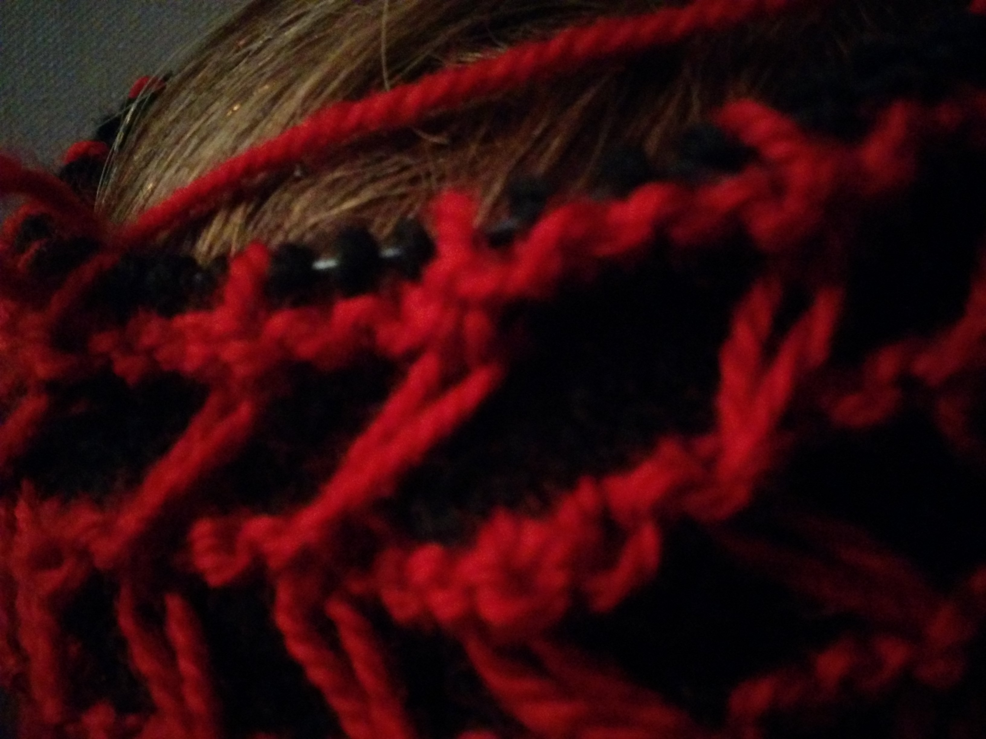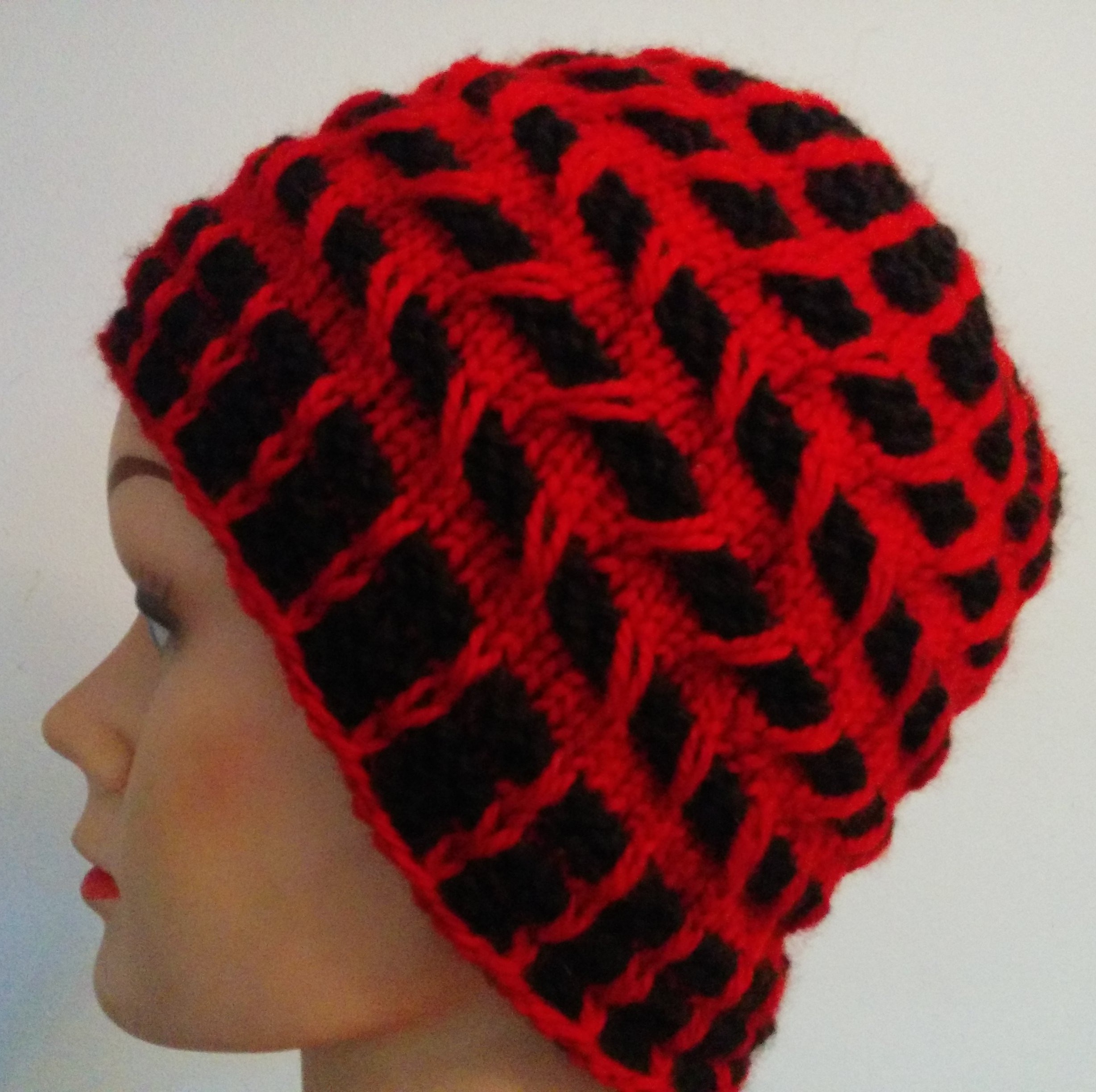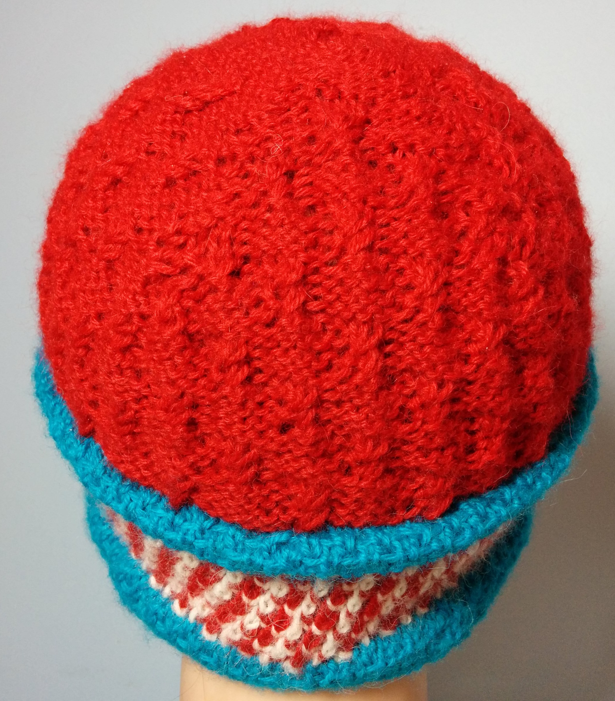 For this hat, I cast on the 120 stitches and did 14 rows of Woven Stitch, pg 95 with turqouise., Then I joined back into the cast on edge with white. I did 2 1/4 inches of Bubble Tweed, pg 66, then back to Woven Stitch for 10 rows, then joined back in again to form a roll. I then used Twisted Basket Stitch, pg 118 for the top of the hat. There were 15 repeats of the Twisted Basket Pattern, I decreased in every third one, leading to 5 points of decrease. I used double decreases every other row to the top. it went as planned from the beginning and I didn’t have to rip out at all along the way.