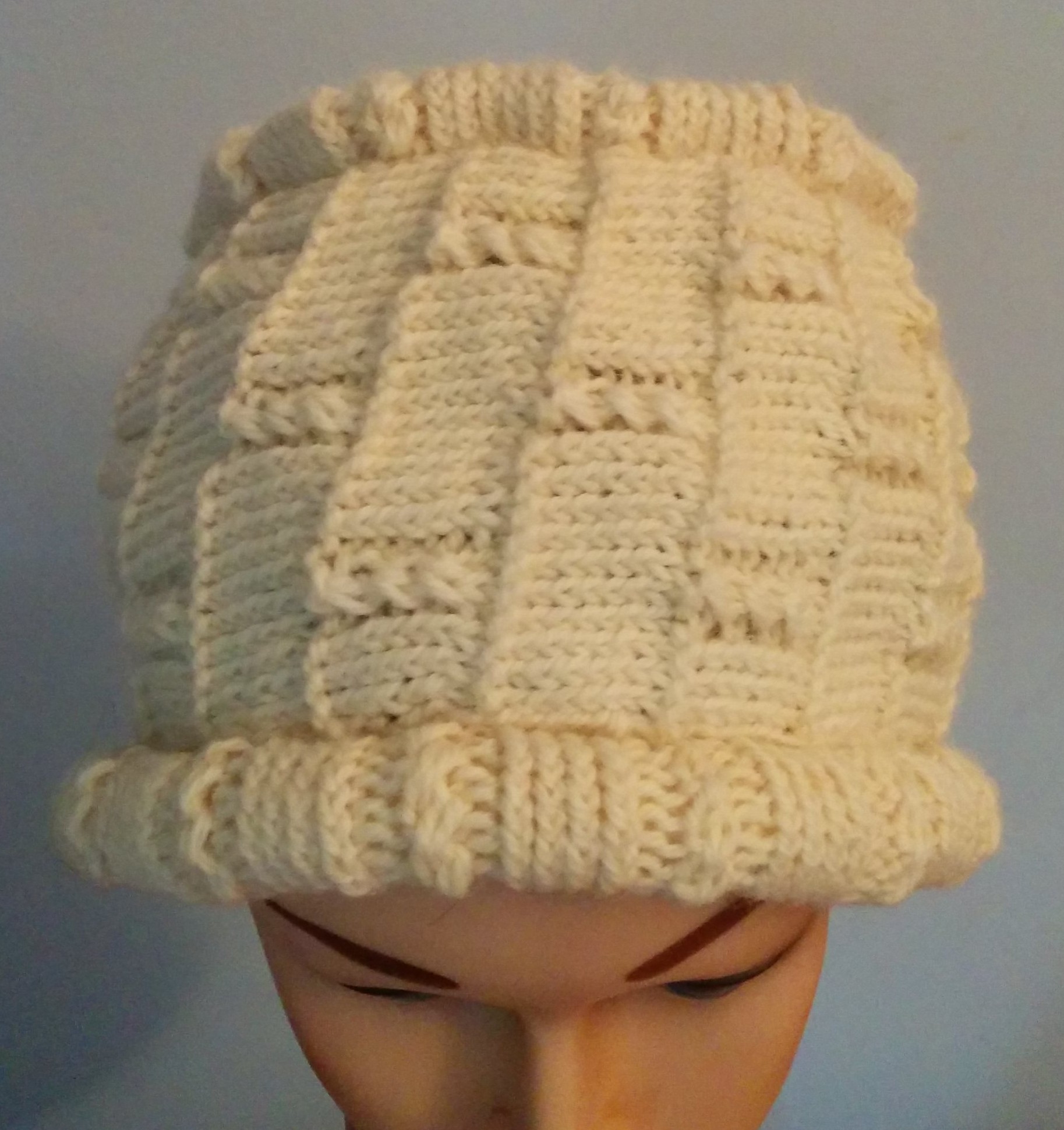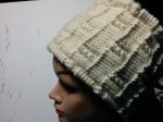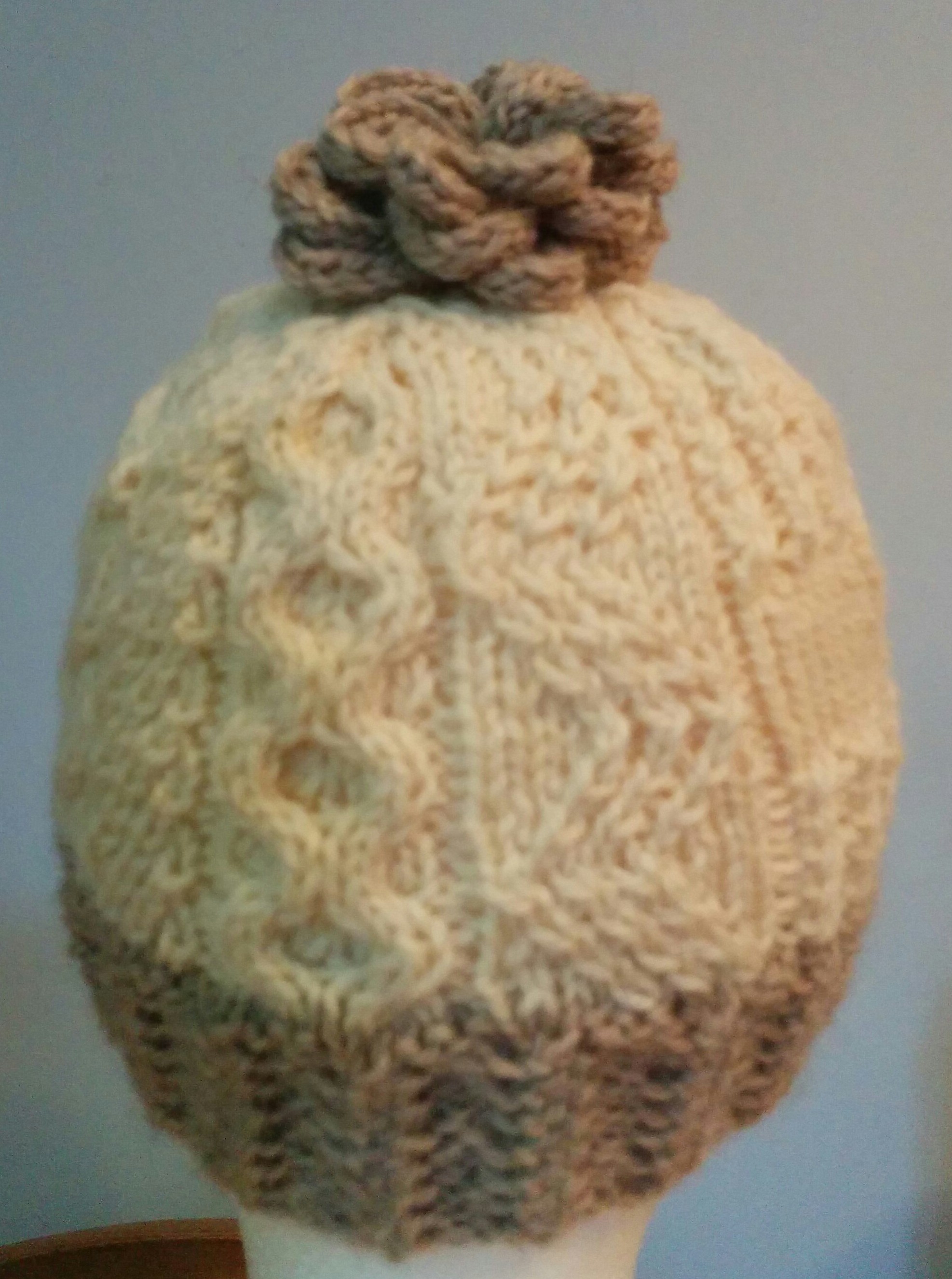 I cast on 102 stitches and did the ribbing (Zigzag Knotted Rib, pg 43) on two needles. I changed to a round needle for the pattern stitches which were (from left) Spiral Columns, pg 121, Aran Honeycomb, pg 273, Twist Zigzag, pg 119, Bavarian Check Pattern, pg 117, Elongated Aran Honeycomb, pg 273 and Shadow Cable, pg 273—see top picture for these last two stitches. I did each pattern twice so there were 12 vertical strips in the hat.