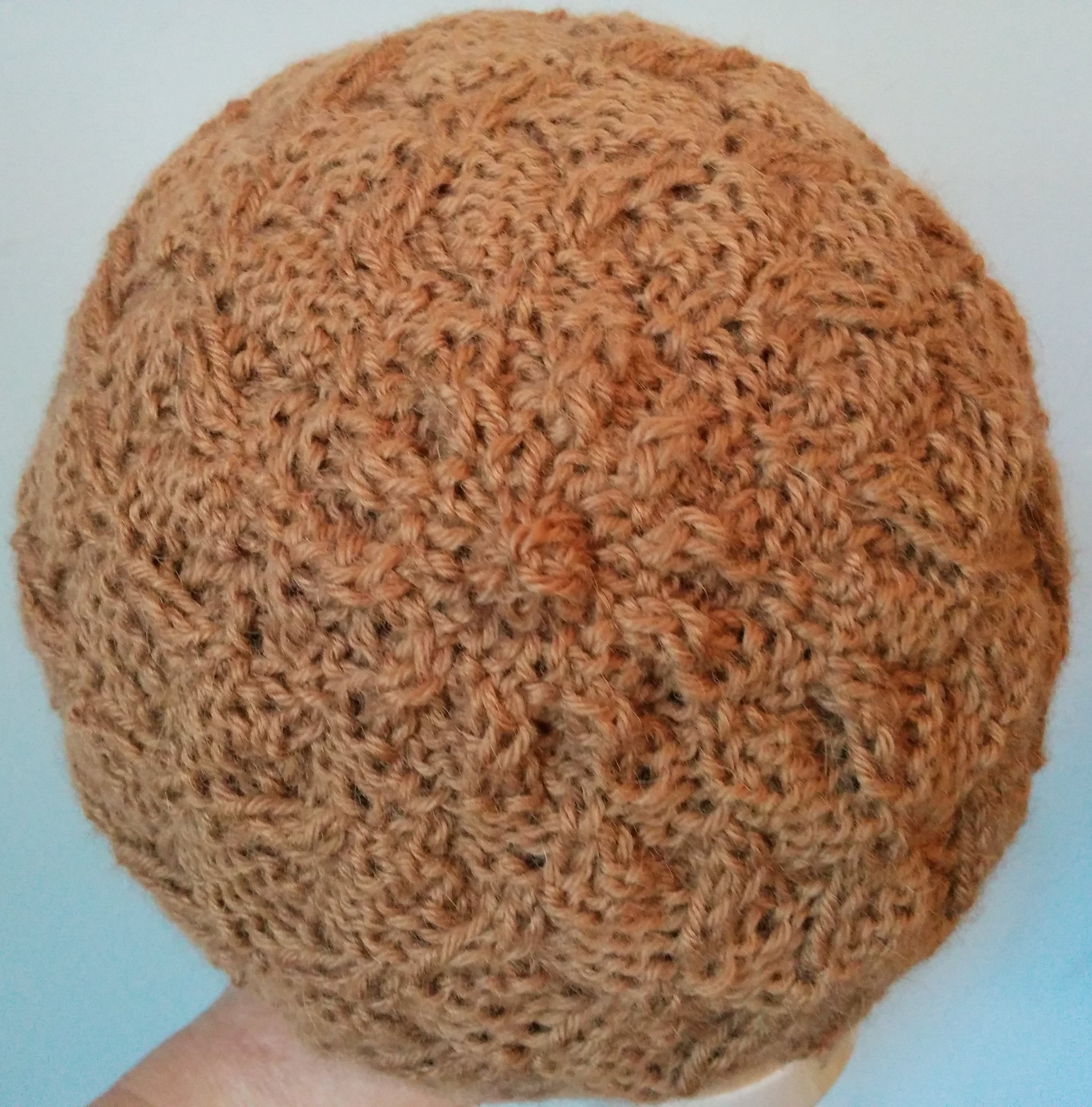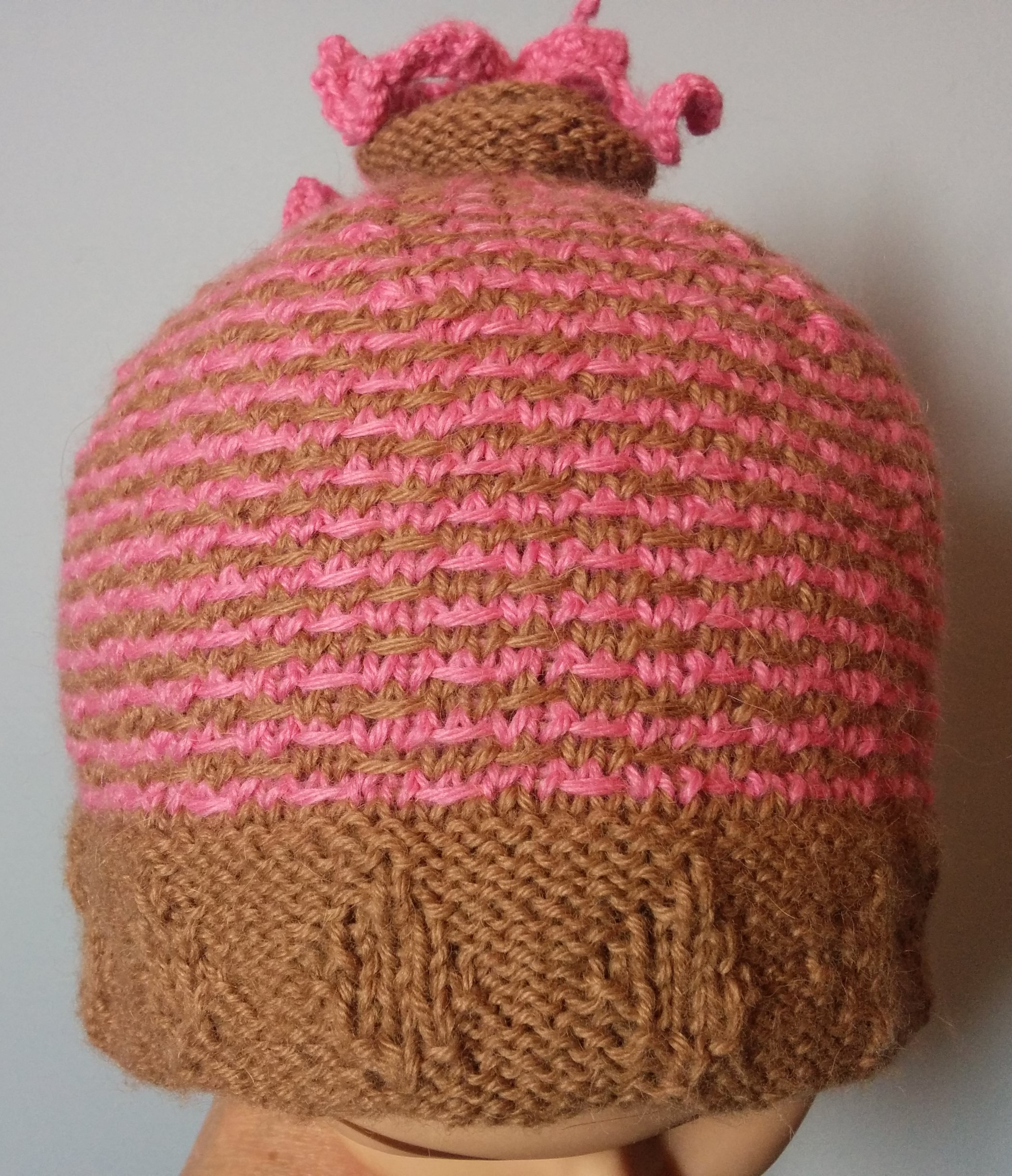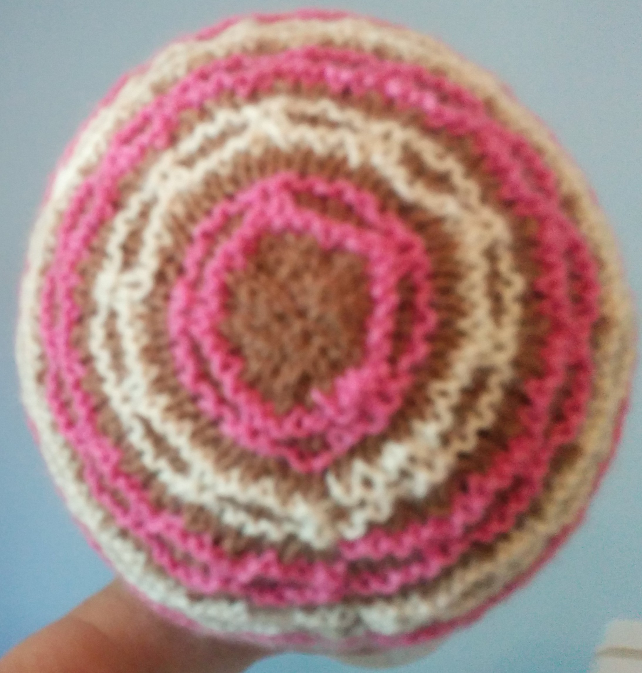 I cast on 120 stitches and used Organ-Pipes pattern, pg 23 as the ribbing, then switched to Chain Stripes, pg 66. In this case, I decreased in the second of the two plain knit brown rows between the coloured chains. The first time I did k2, k2tog around (90 st left). I switched the pattern from k6 slip 2 to k4, slip 2 at this point. Next time i did k1, k2 together around (60 st left) and stayed with the k4, slip 2 on the pattern rows. The third time I did k2 tog around (30 st left). After the final chain rows, I just got rid of the rest of the stitches in 6 rows.