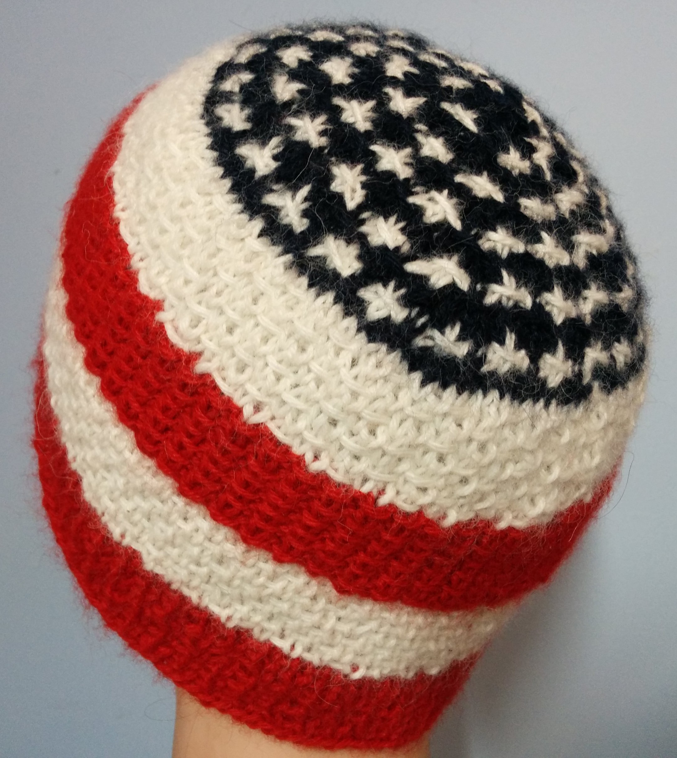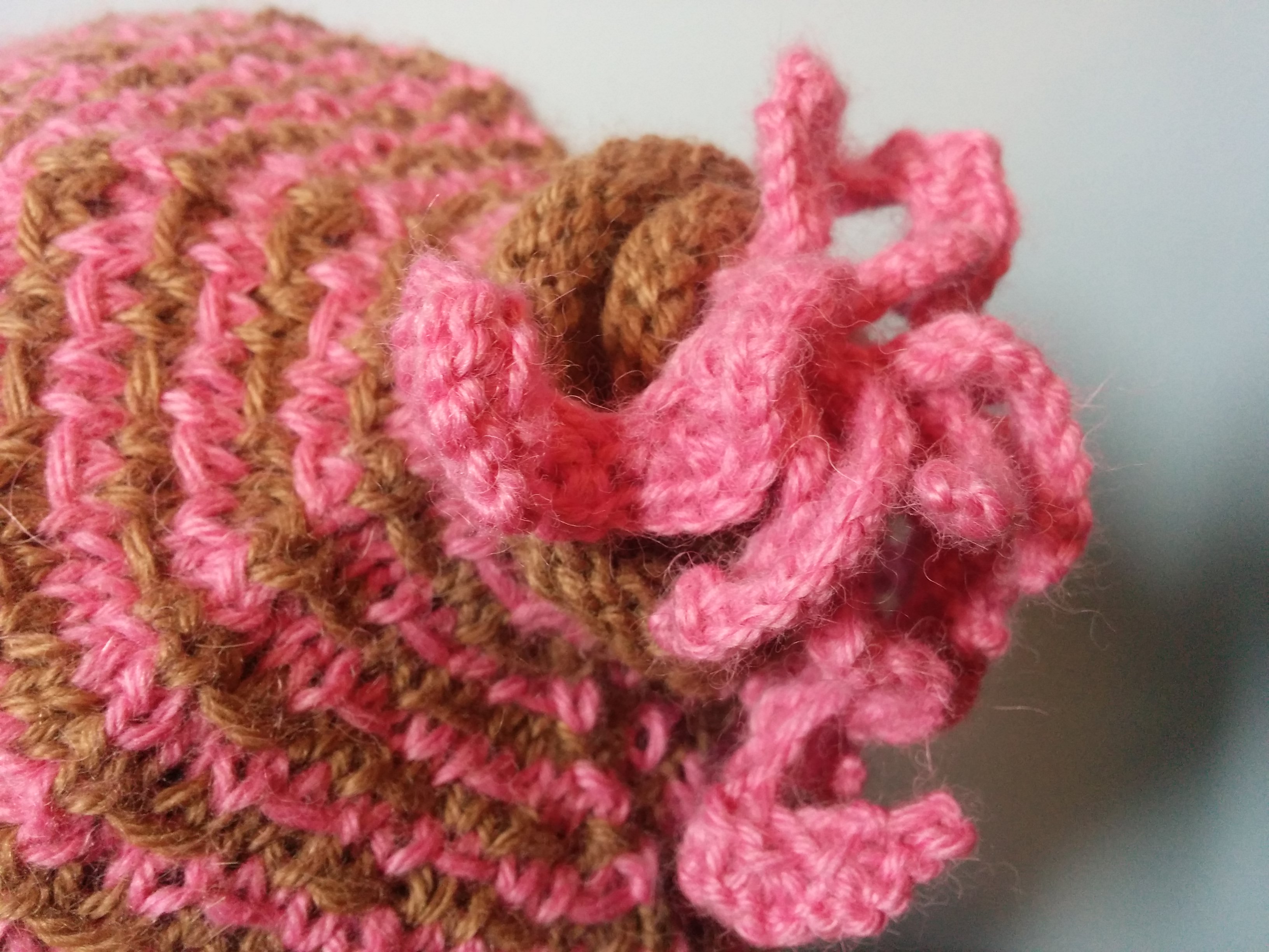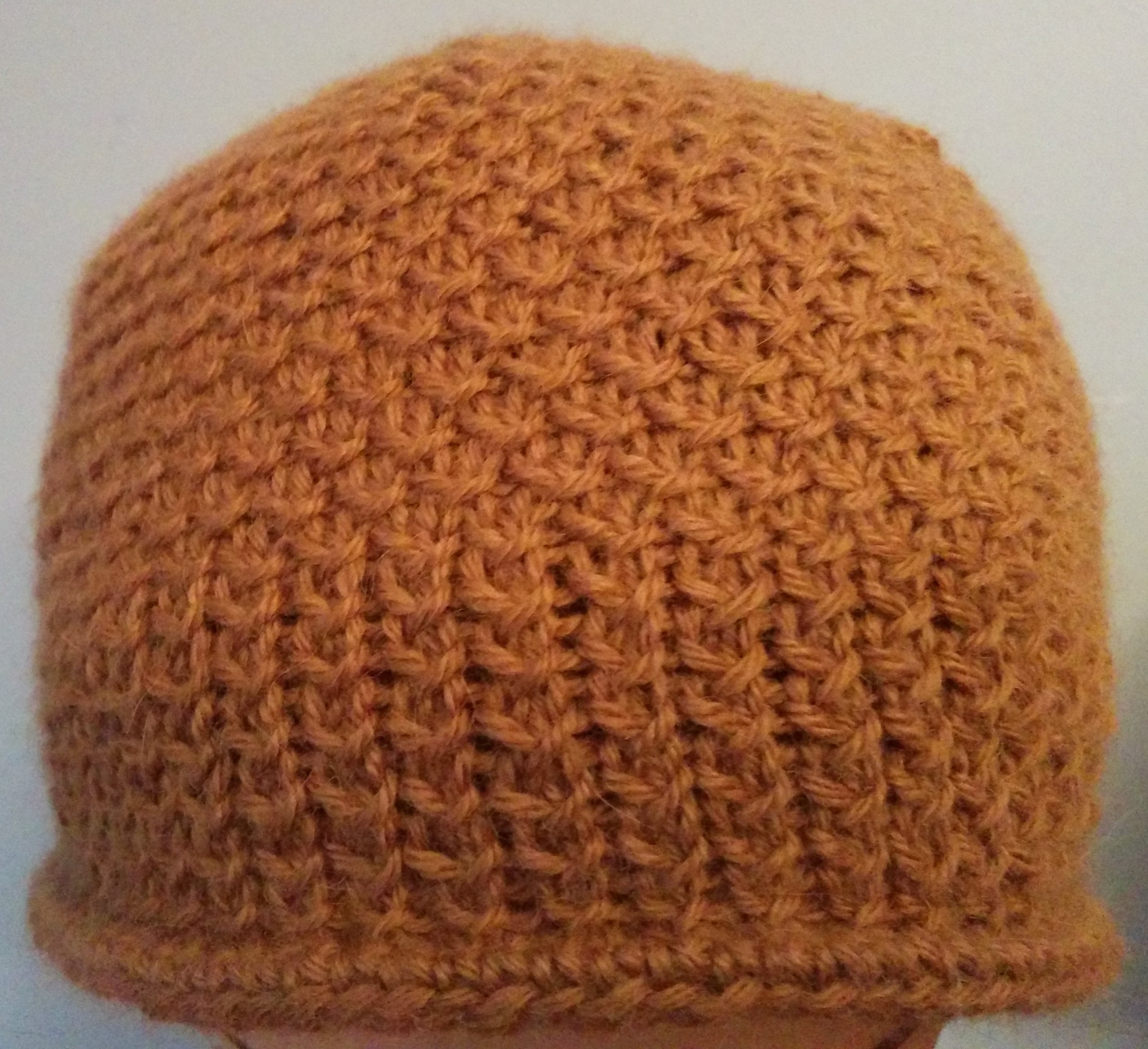 I cast on 120 stitches and used Organ-Pipes pattern, pg 23 as the ribbing, then switched to Chain Stripes, pg 66. In this case, I decreased in the second of the two plain knit brown rows between the coloured chains. The first time I did k2, k2tog around (90 st left). I switched the pattern from k6 slip 2 to k4, slip 2 at this point. Next time i did k1, k2 together around (60 st left) and stayed with the k4, slip 2 on the pattern rows. The third time I did k2 tog around (30 st left). After the final chain rows, I just got rid of the rest of the stitches in 6 rows.