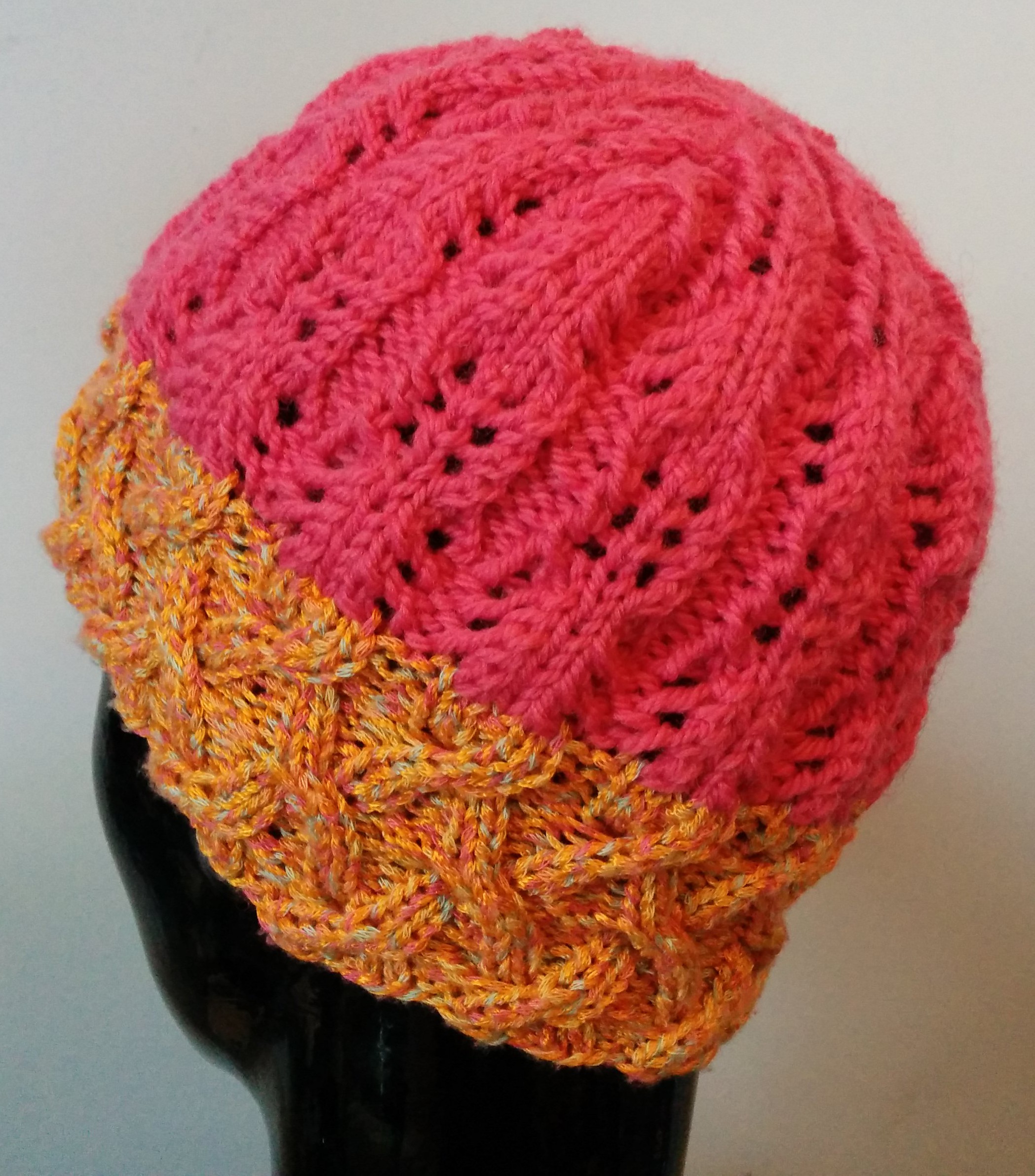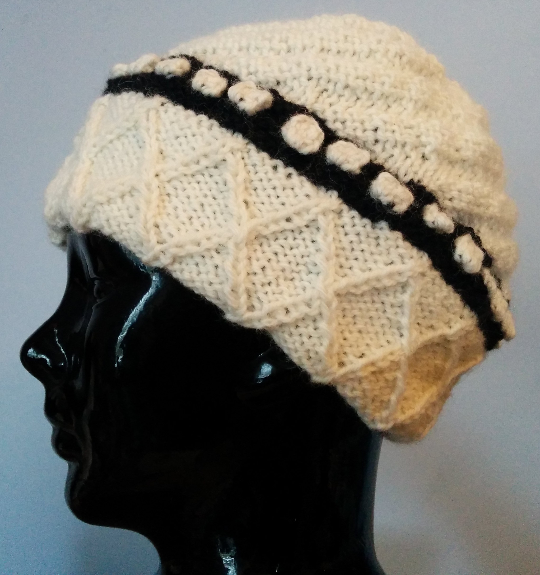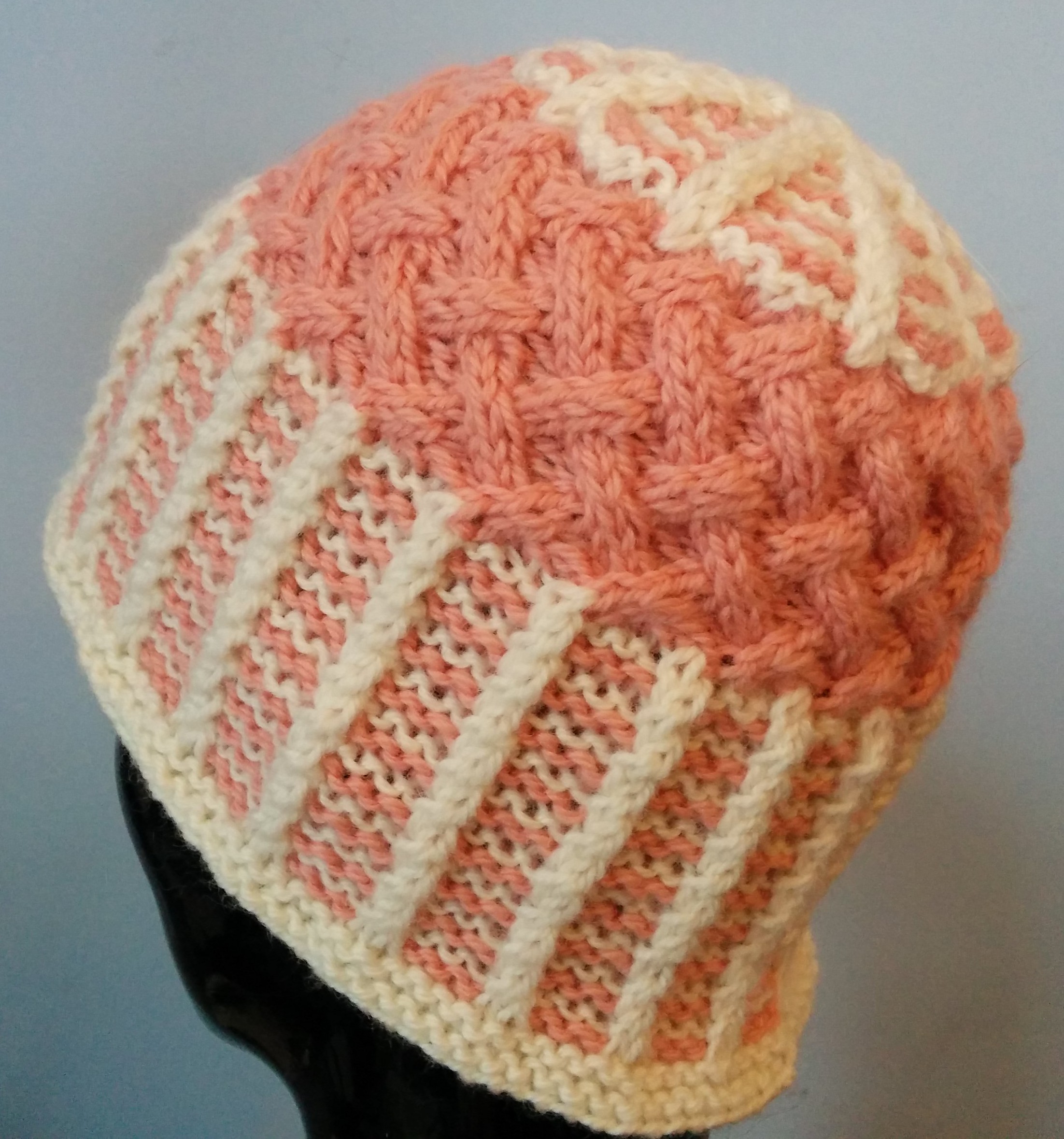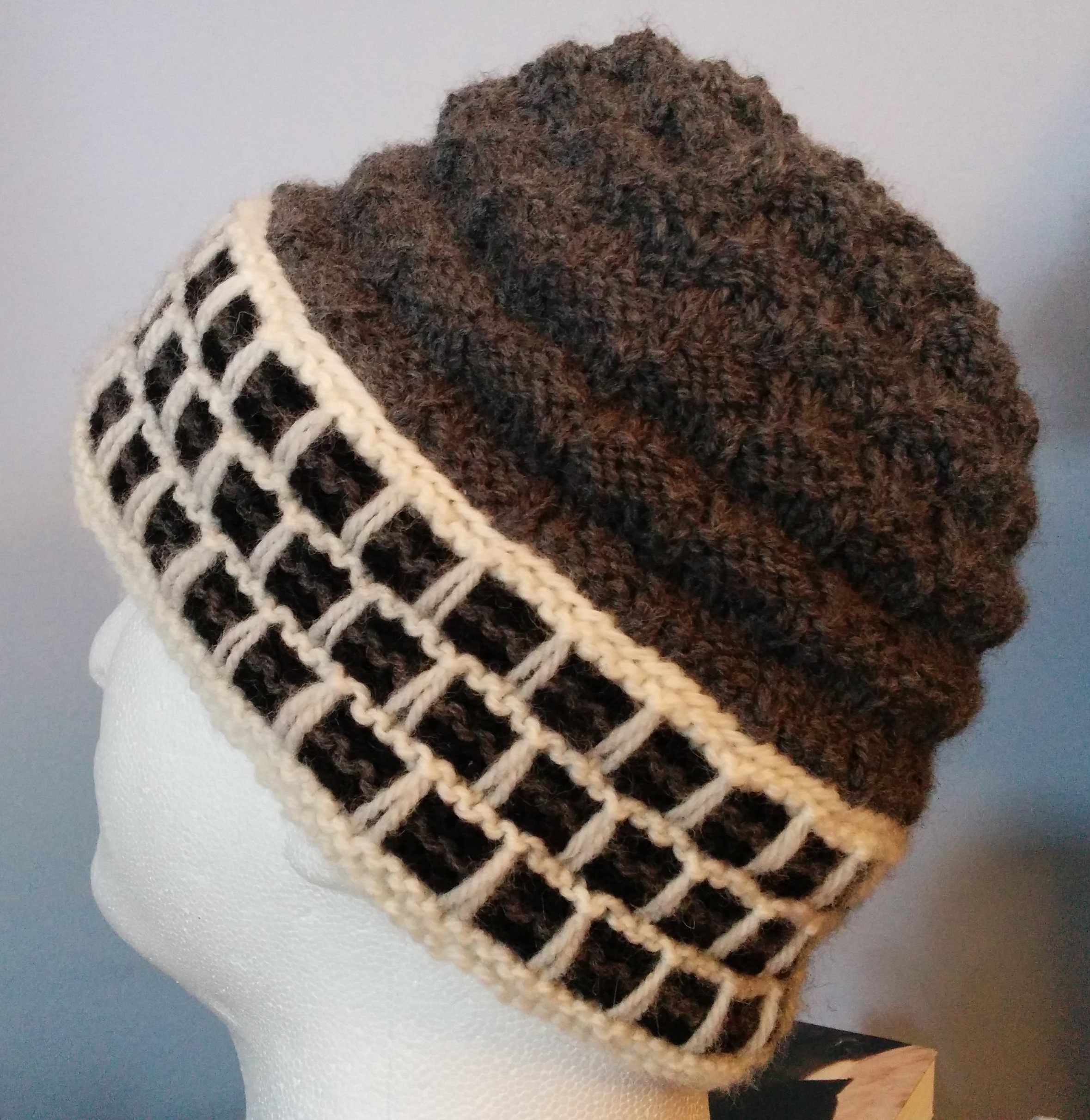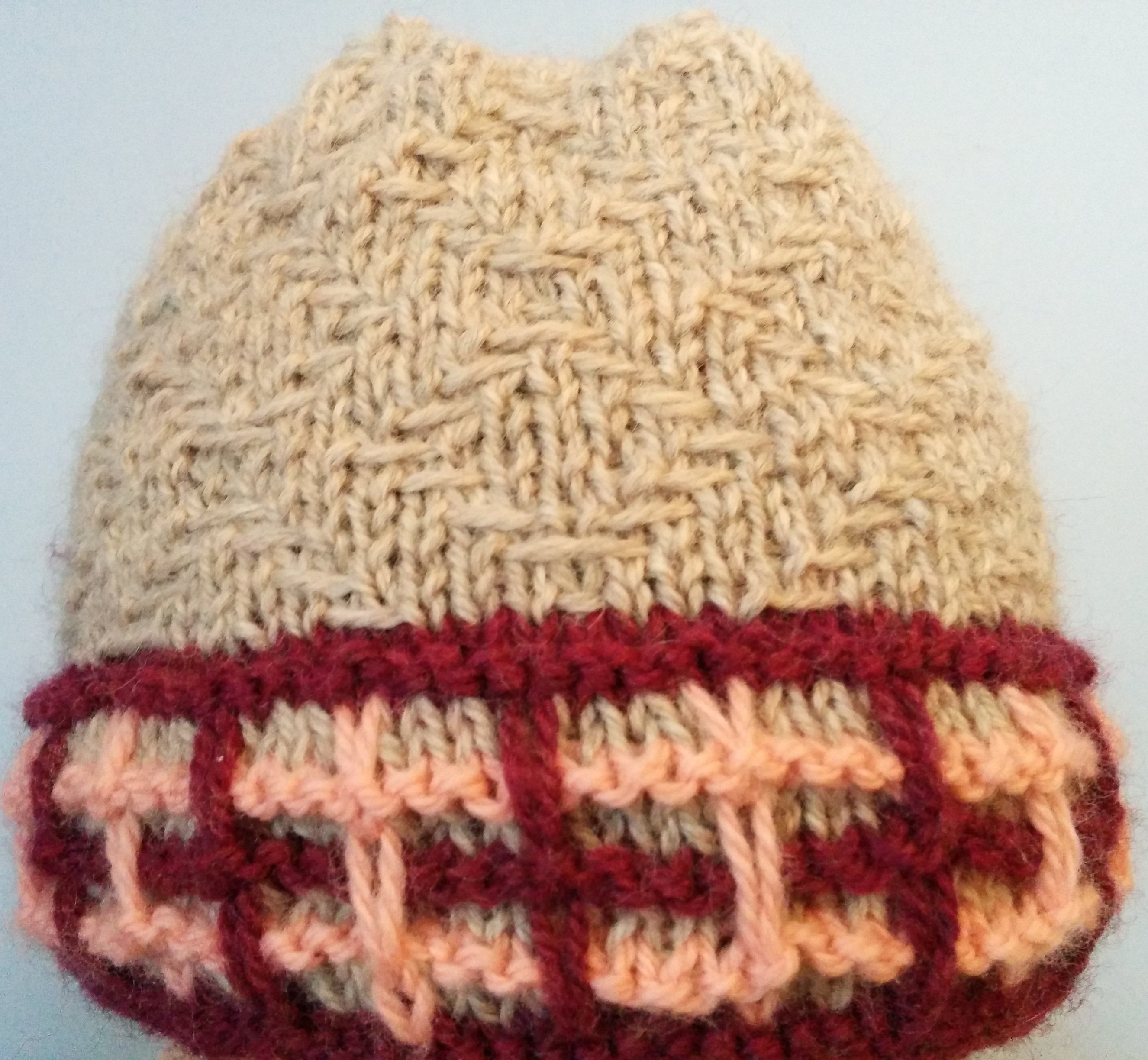 I joined both back together, reduced to 96 stitches and continued up the hat with Woven Diamond Pattern, pg 97. I gotta say, I am in love with these patterns that use the floats as decorative elements on the front of the work. This was one I had been savouring the thought of for a while. I am glad I like this hat, because I really wanted to make a decent hat with this stitch. I am also glad I was with my Canterbury Piecemakers (aka Wednesday coffee group) when I was about to do the top of the hat. Albertina said I shouldn’t do a big topper, just a button or something to bring the maroon back into play. I did 8 rows of garter stitch on the last 12 stitches, then k2tog around, did a row on 6 stitches and drew my end through. I used the end to secure the button on top.