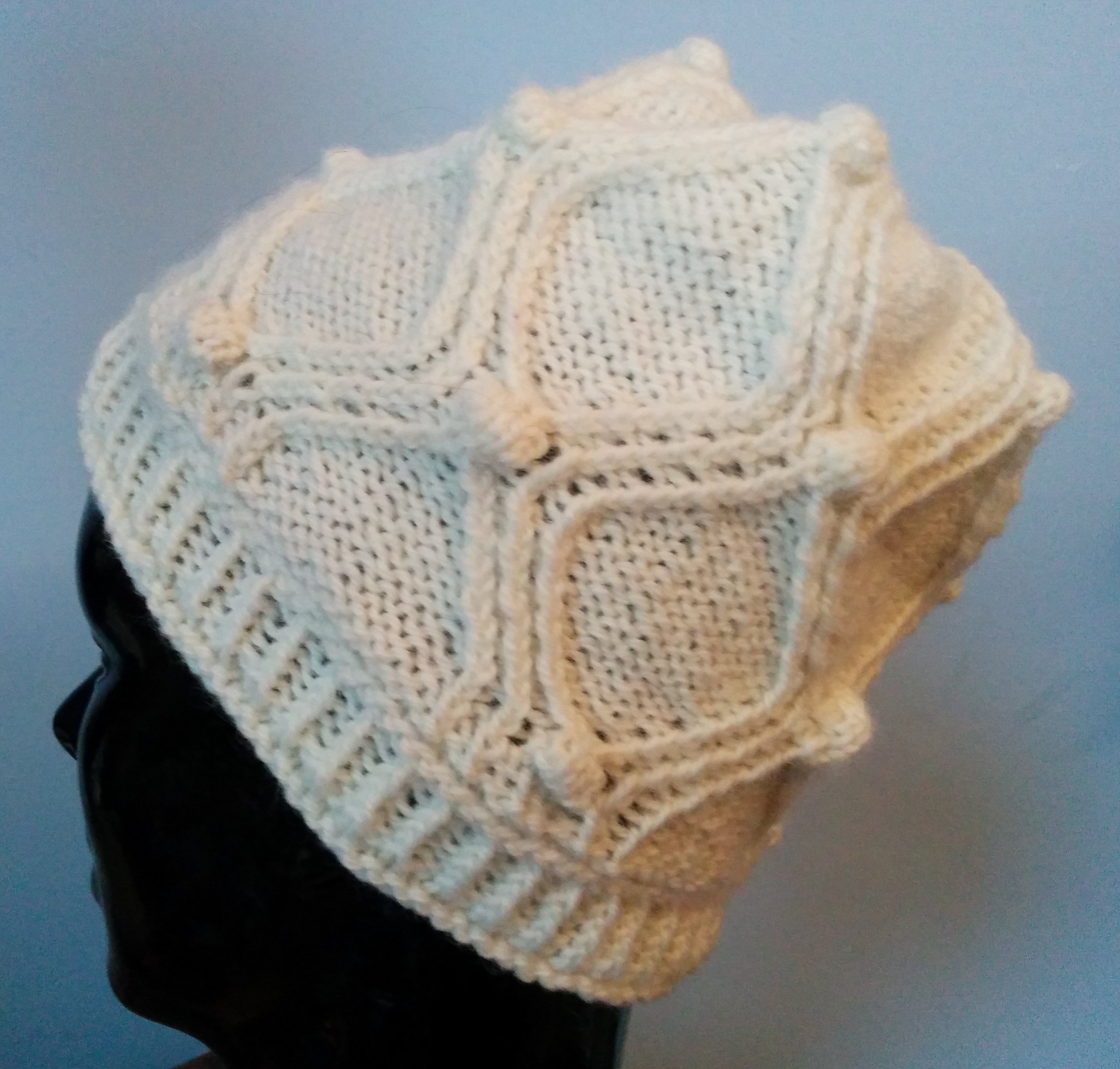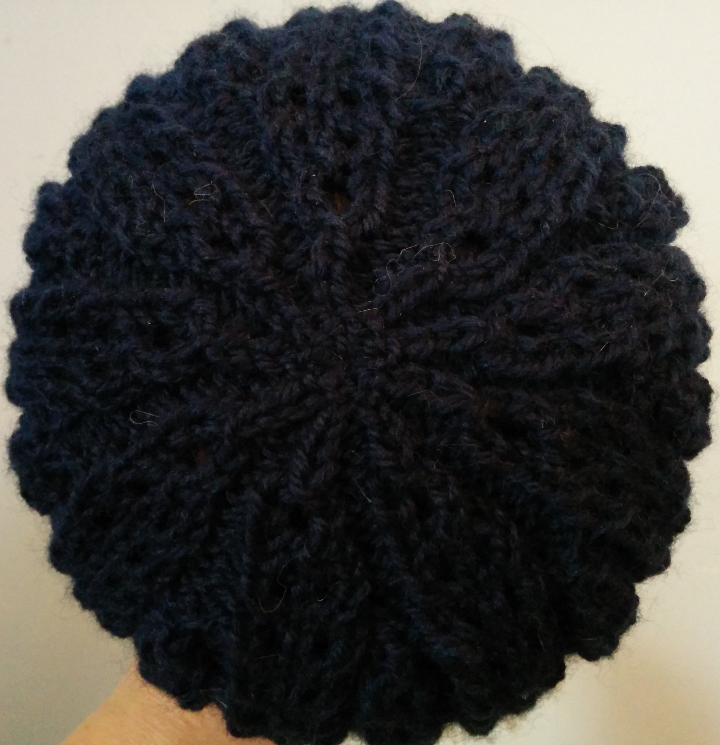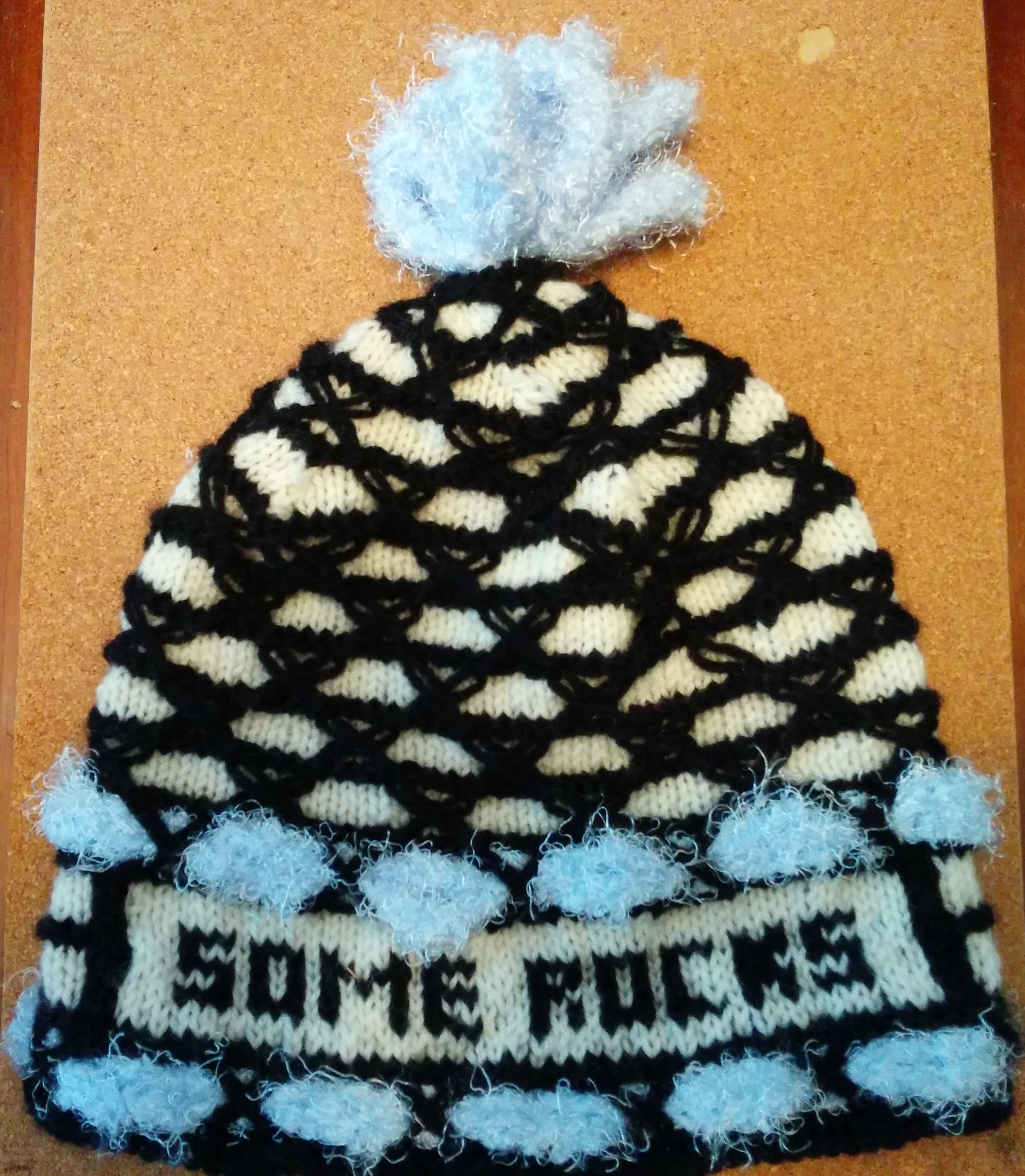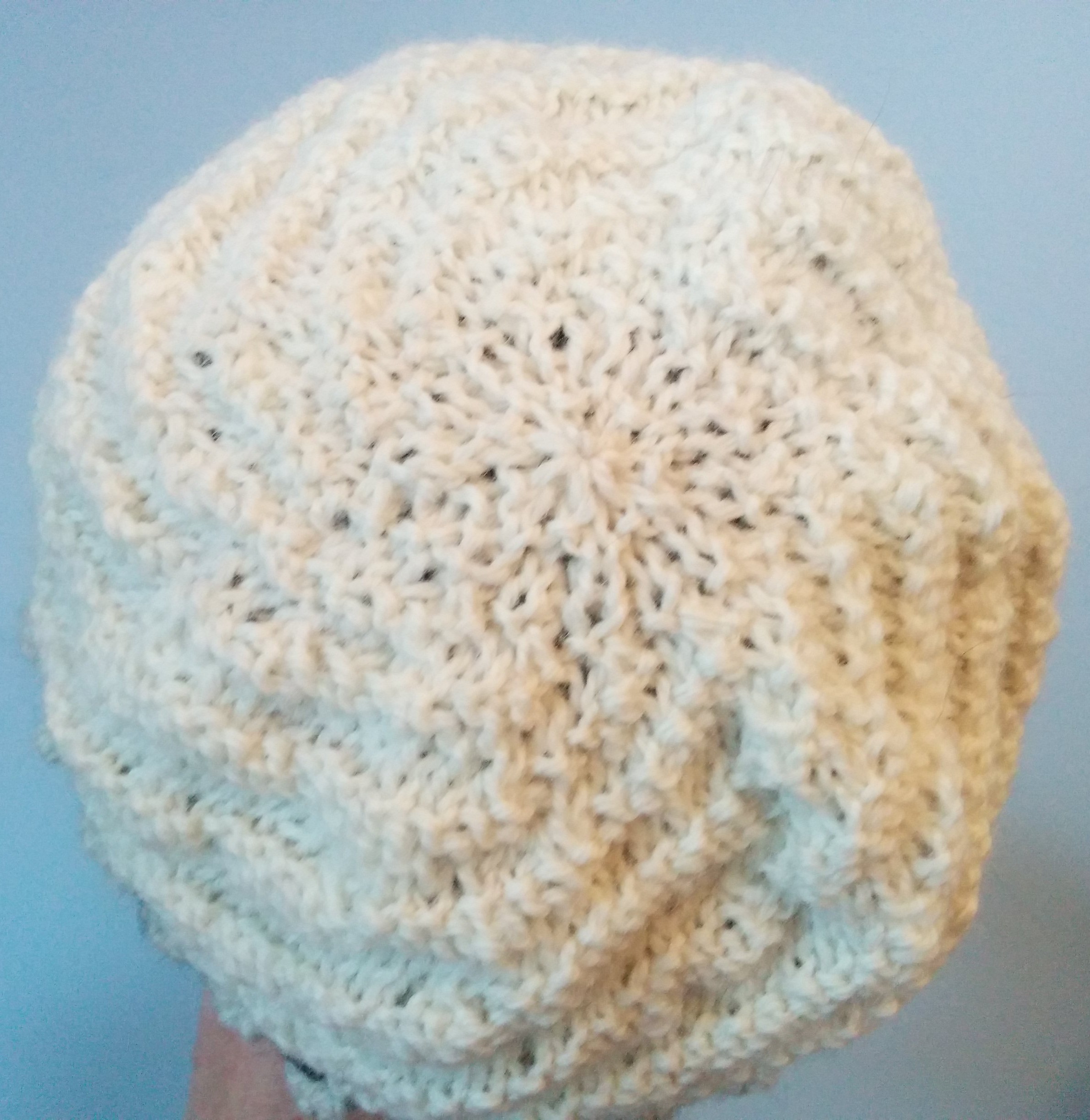 I joined both back together, reduced to 96 stitches and continued up the hat with Woven Diamond Pattern, pg 97. I gotta say, I am in love with these patterns that use the floats as decorative elements on the front of the work. This was one I had been savouring the thought of for a while. I am glad I like this hat, because I really wanted to make a decent hat with this stitch. I am also glad I was with my Canterbury Piecemakers (aka Wednesday coffee group) when I was about to do the top of the hat. Albertina said I shouldn’t do a big topper, just a button or something to bring the maroon back into play. I did 8 rows of garter stitch on the last 12 stitches, then k2tog around, did a row on 6 stitches and drew my end through. I used the end to secure the button on top.