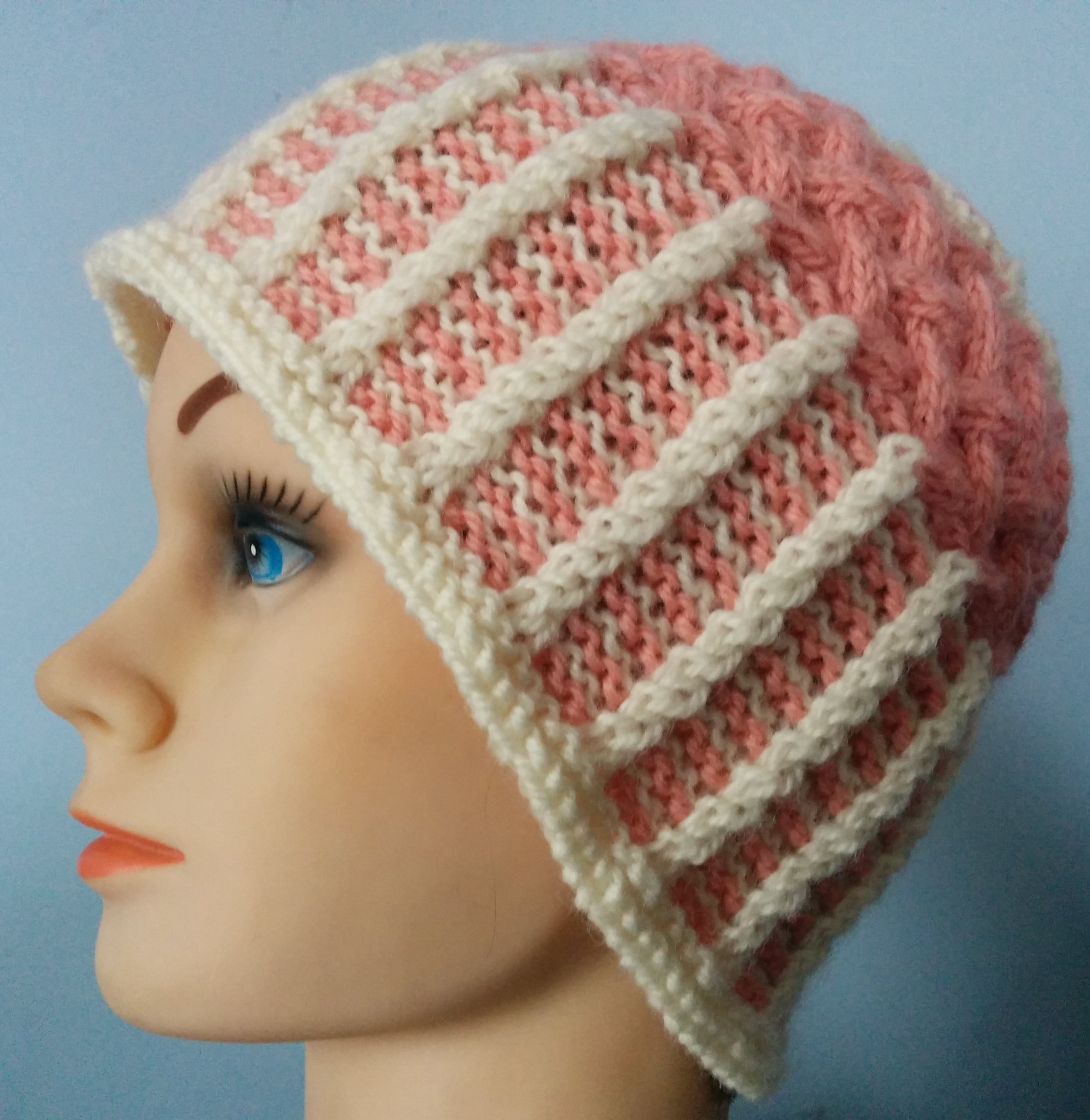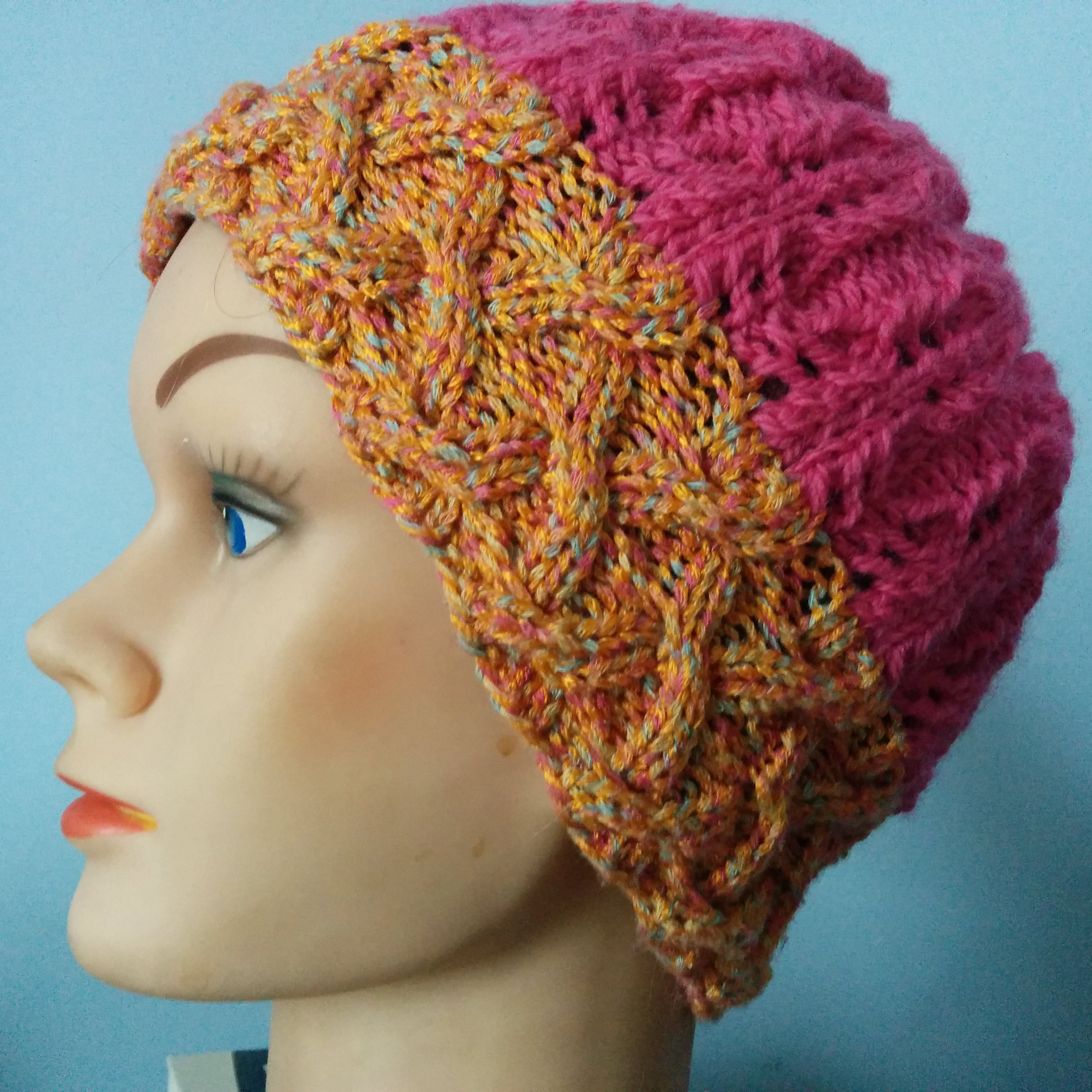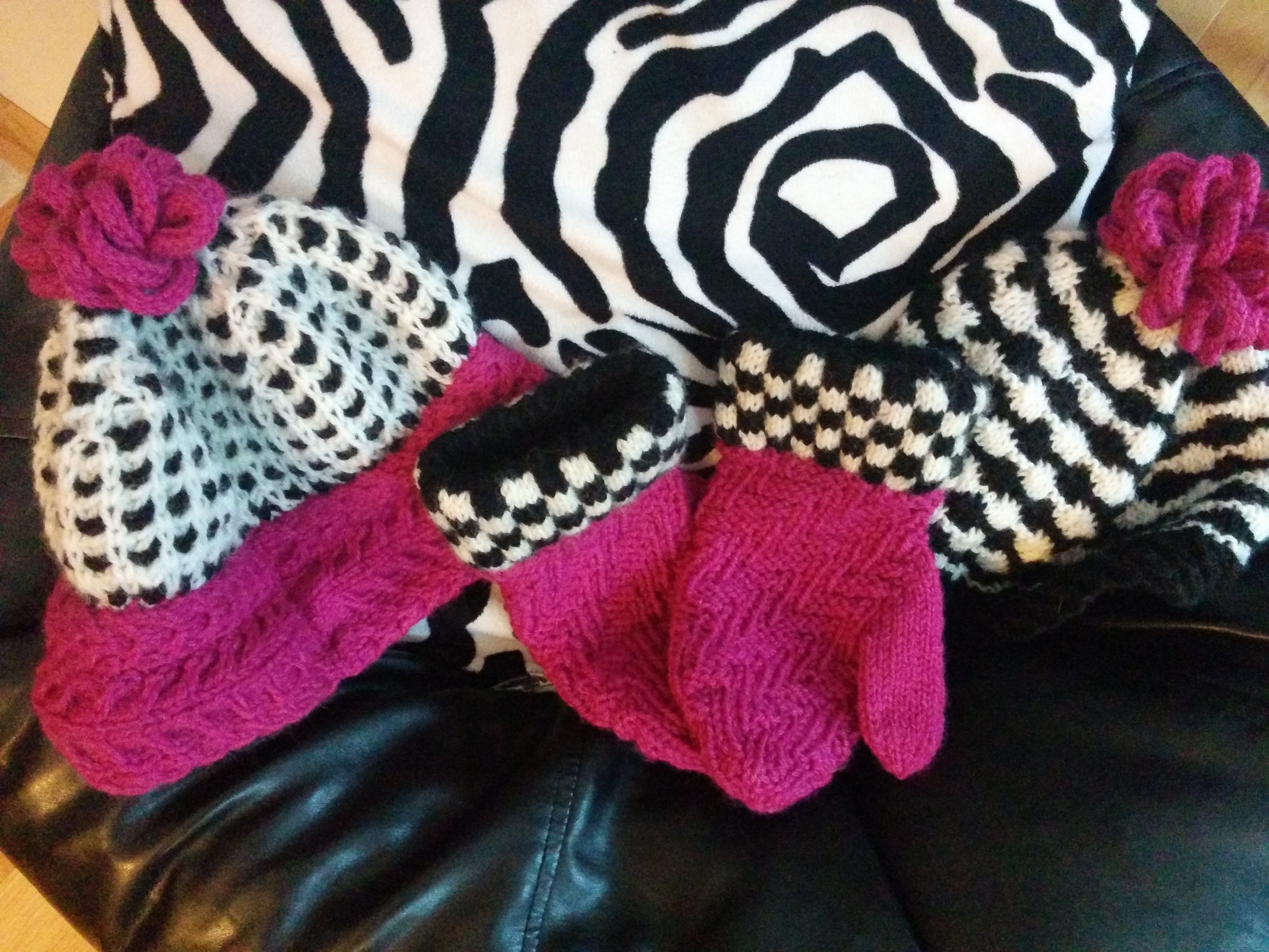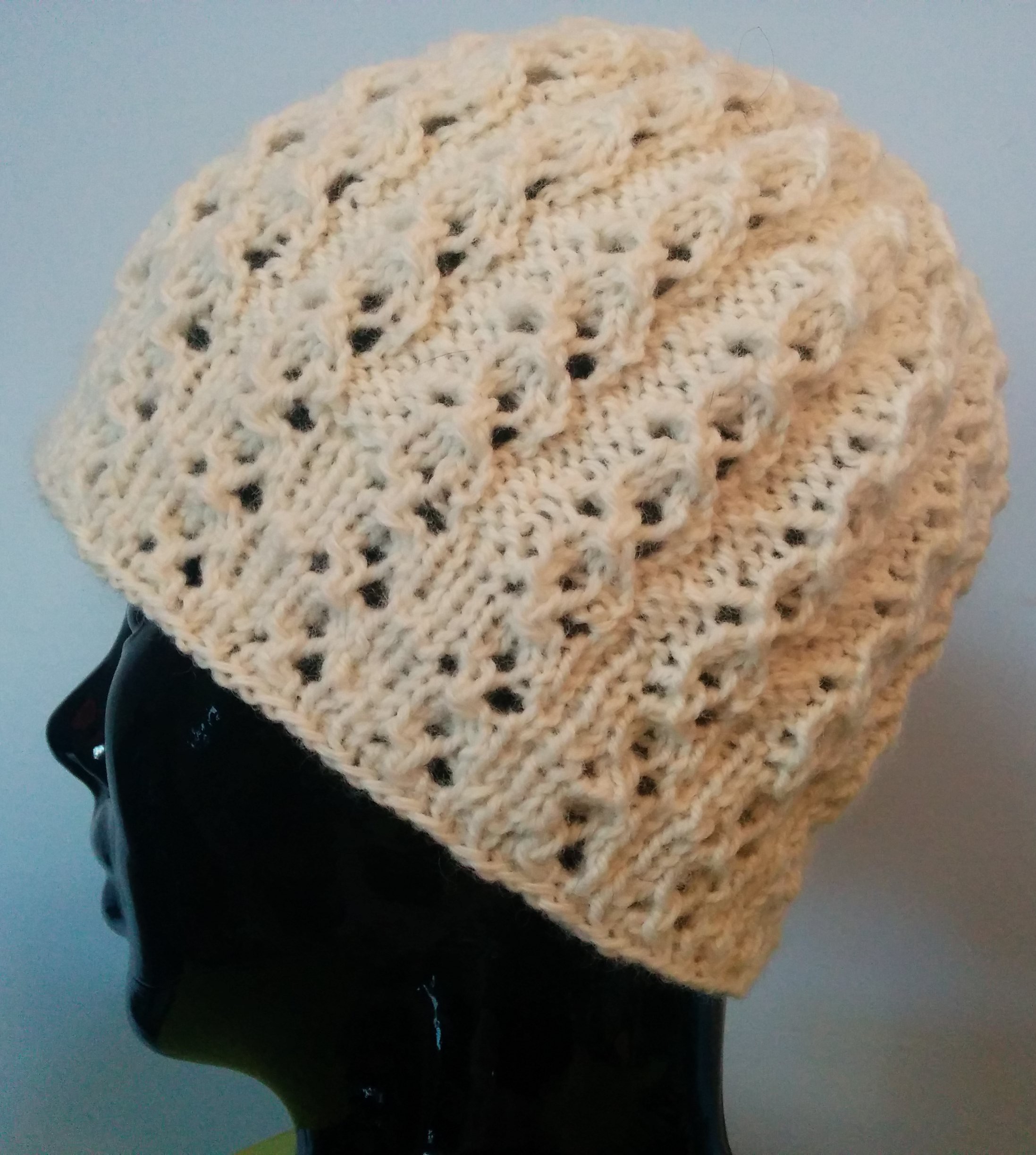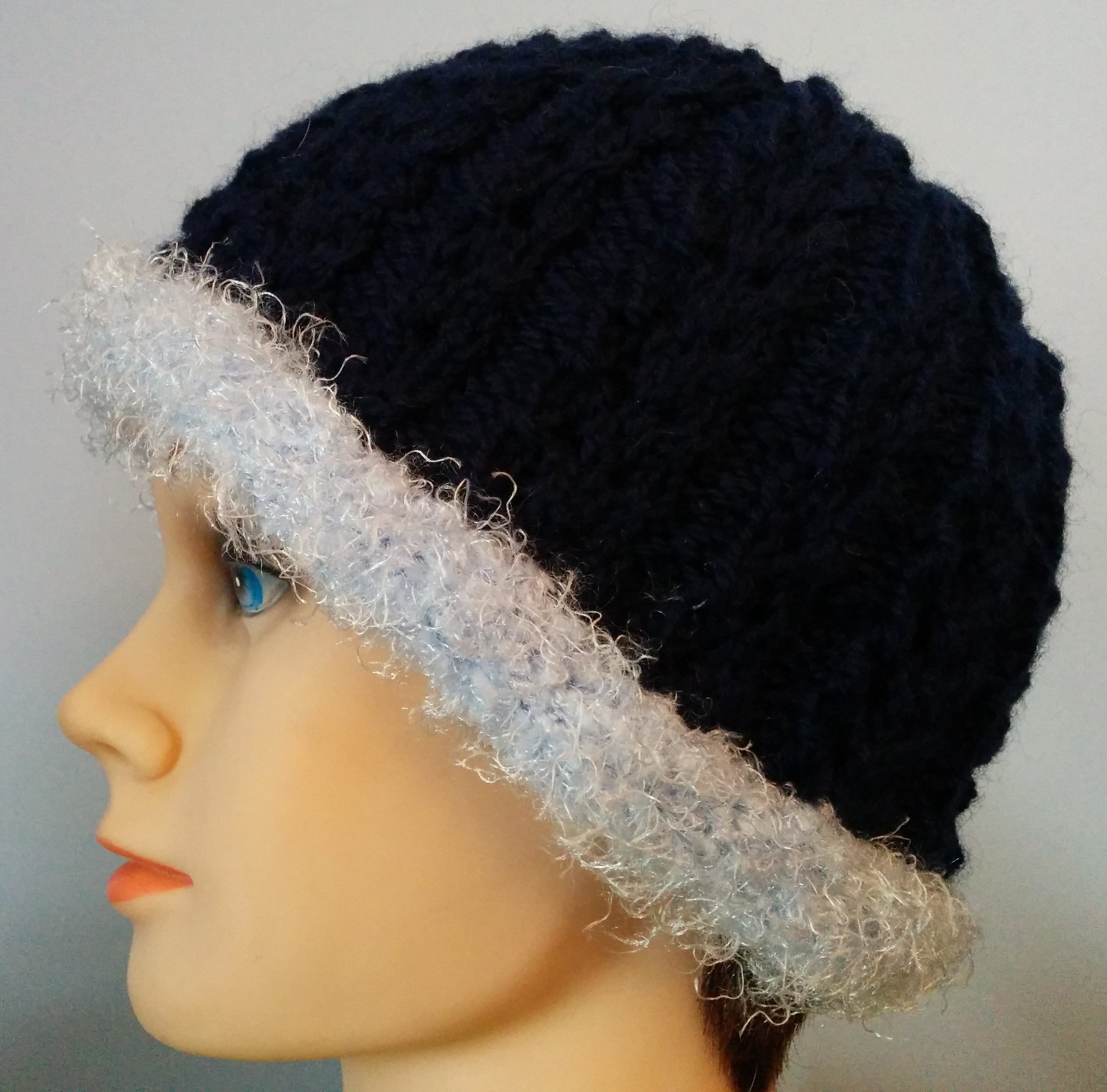 I joined both back together, reduced to 96 stitches and continued up the hat with Woven Diamond Pattern, pg 97. I gotta say, I am in love with these patterns that use the floats as decorative elements on the front of the work. This was one I had been savouring the thought of for a while. I am glad I like this hat, because I really wanted to make a decent hat with this stitch. I am also glad I was with my Canterbury Piecemakers (aka Wednesday coffee group) when I was about to do the top of the hat. Albertina said I shouldn’t do a big topper, just a button or something to bring the maroon back into play. I did 8 rows of garter stitch on the last 12 stitches, then k2tog around, did a row on 6 stitches and drew my end through. I used the end to secure the button on top.