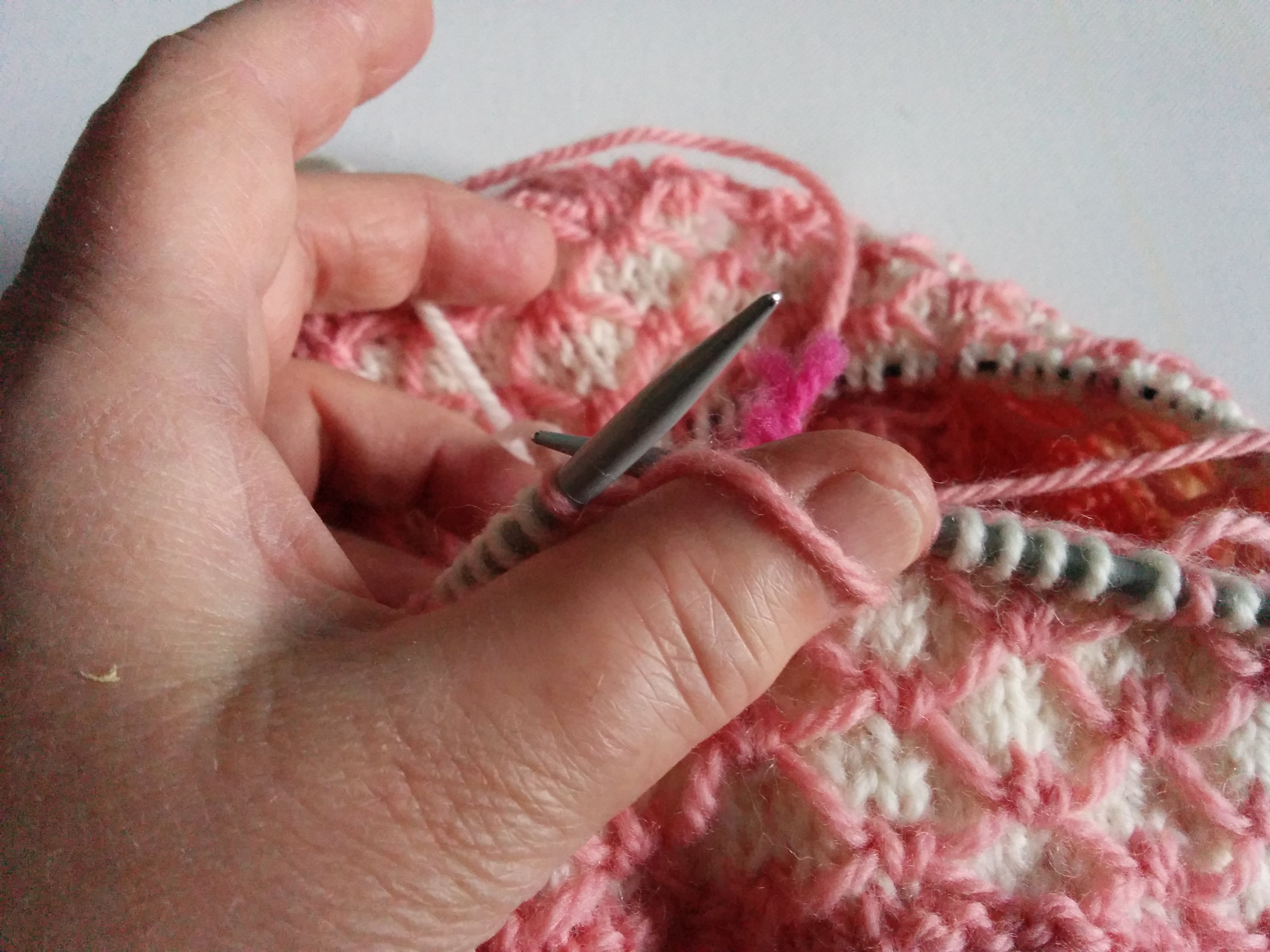 To decrease, I did slip 1, k2tog psso at six points every other row, on top of one just completed set of diamonds and in between another set of diamonds.