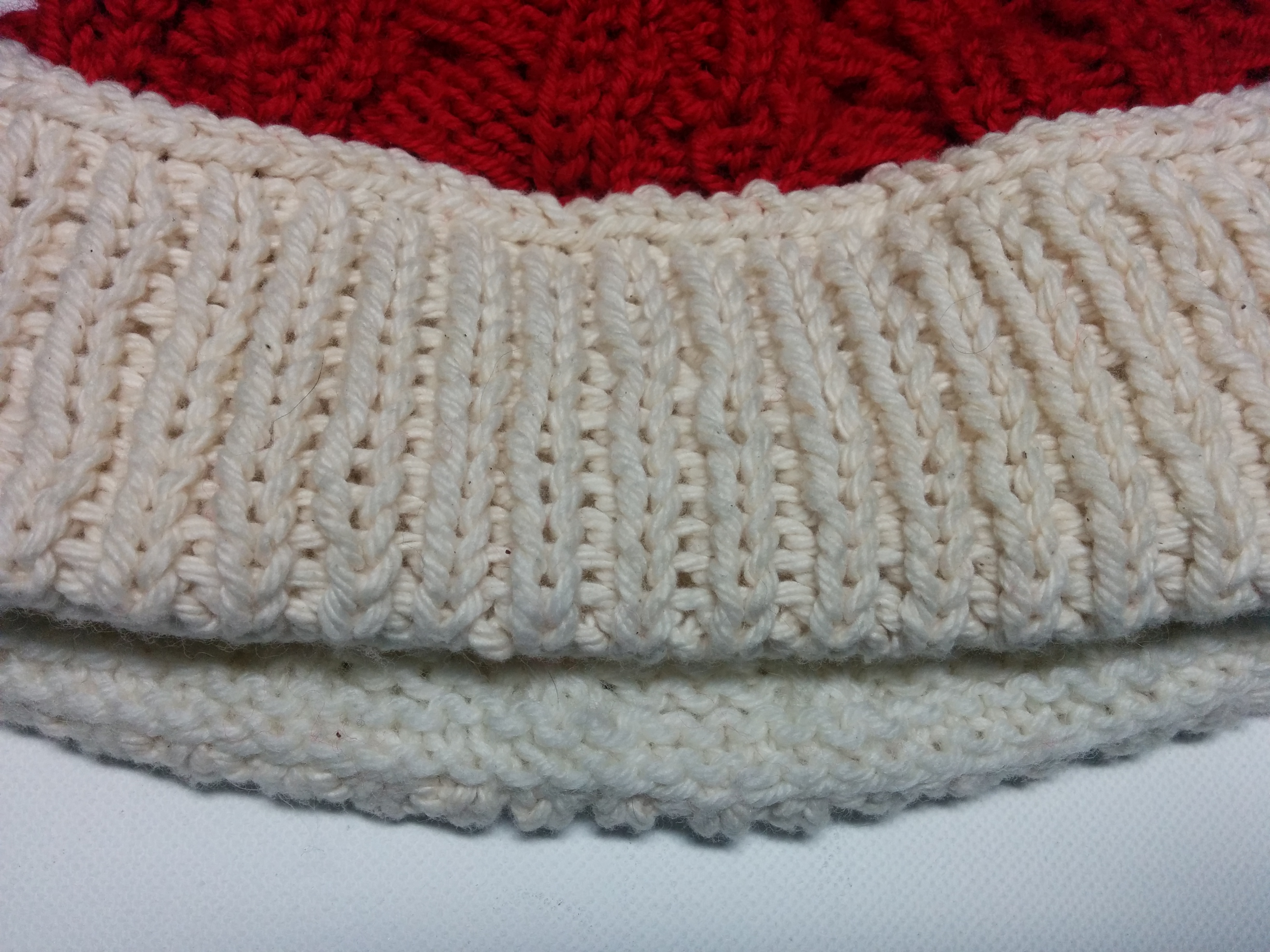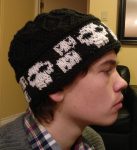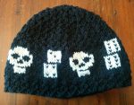 Chris’s hat: I cast on 112 stitches on straight needles and did two repeats of the Banded Rib Pattern, pg 123, then I decided I liked the “wrong” side better at this point which was handy as I could do it on round needles this way. There is only one pattern row which has to be worked and I wasn’t sure if I could work it from the “right” side in the round. I went to a round needle at this point and did the skull/dice band. I went with 4 skulls and 4 sets of dice, where I had used 5 on Jake’s. I had felt the colour work a bit crowded on his. I also changed (improved?) the skulls a bit, adding a nose and a row of black between the teeth rows. I went back to banded rib and decreased by getting rid of every 7th four stitch repeat, then every 6th, then every 5th. I originally finished it this way (every 4th, 3rd, etc) but got a weird cone on the top, so I ripped back and got rid of every other repeat instead of every 4th, then, after a pattern row just did ssk, k2tog around, then one row plain and k2tog around once before finishing it off. I decided not to do a double brim because Chris is more of a car to building guy, and the double brim would be too hot.