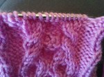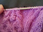 I first decreased inside the cable by purling 2 together twice, making the cable close faster than normal. For the next decrease, when I was putting these two stitches to the outside of the cable, I purled them together with the stitches already on the outside of the cable. Next time, I crossed the two sides of the cables together and held the top two stitches in front of the back two stitches and knit through both stitches together. This both crossed and decreased the cable simultaneously. Next time, I only decreased six stitches in the round by doing a slip one, knit 1 psso at the top of the cable. For the next 2 decreases, I did a purl three together above the cable I had finished off until the other cables started coming together