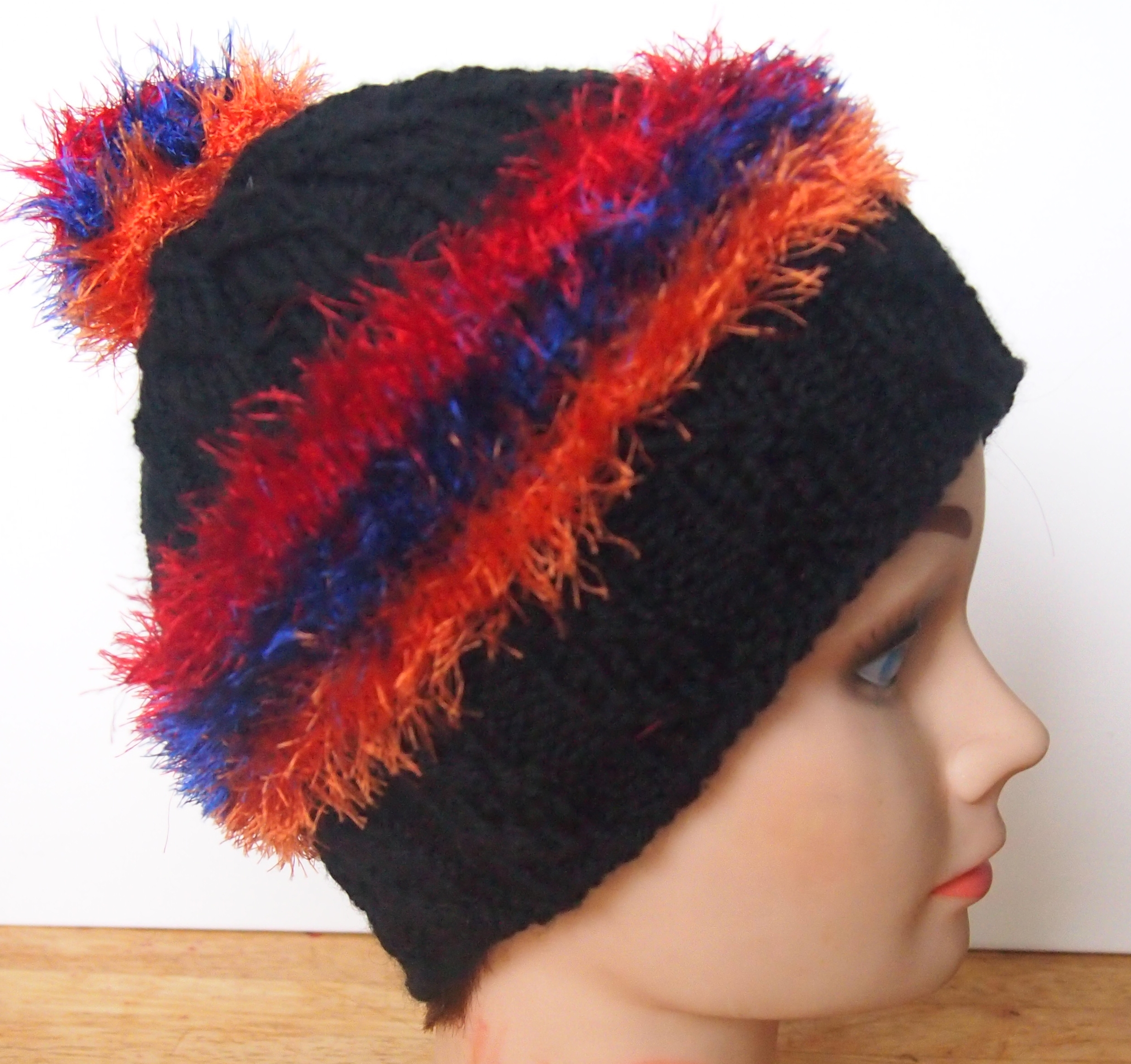 I was taken by the richness of these colours together…I am a sucker for pure hues. I used a 5 stitch cable variation for the black body of the hat, which I knitted in worsted weight yarn (Patons classic wool). After 16 rows I switched to the novelty yarn and knit 4 rows of each colour separated by one row of black between colours. I then returned to the black cabling and put a rose on the top. I will be posting instructions for the rose in a day or so.