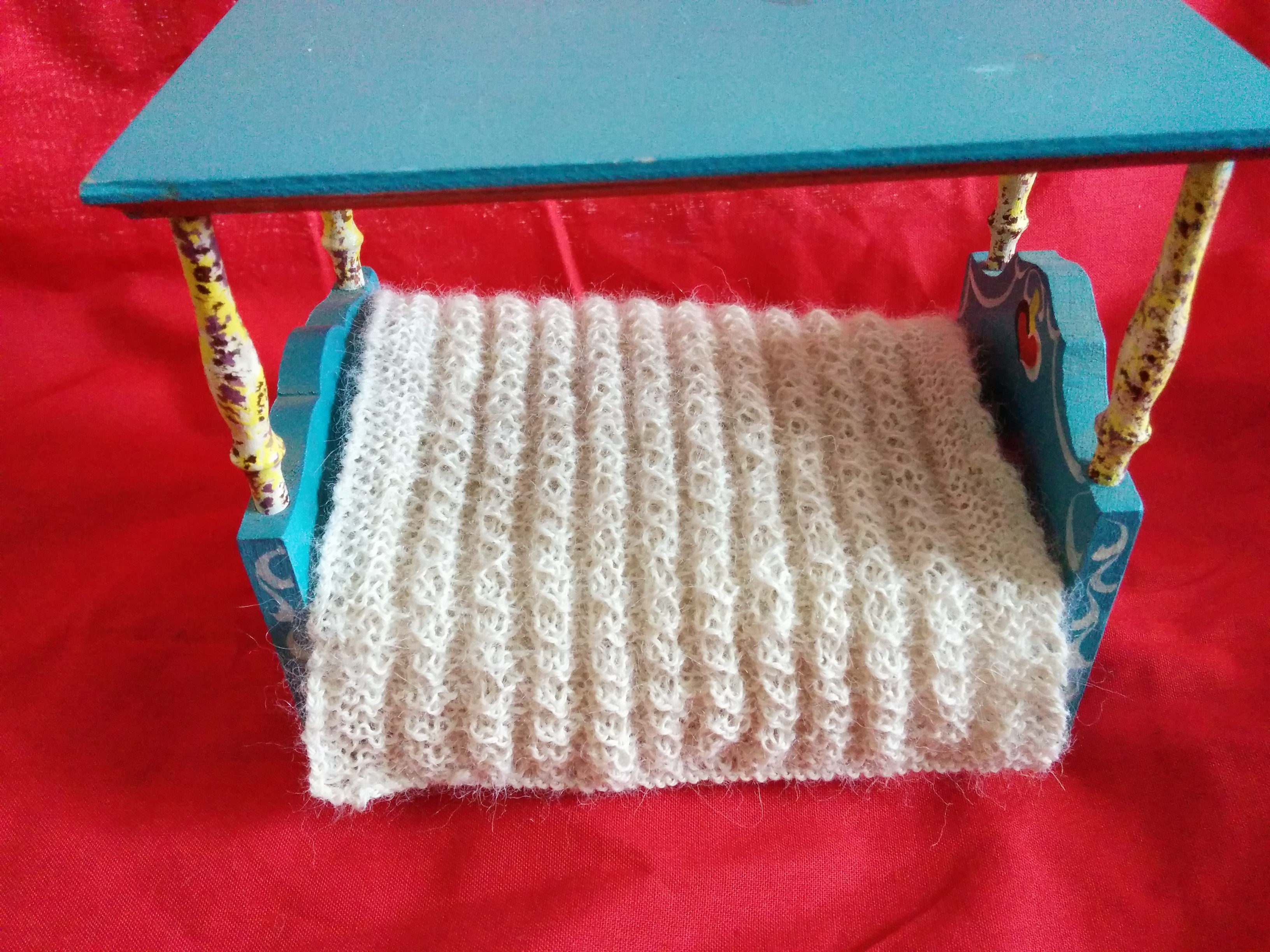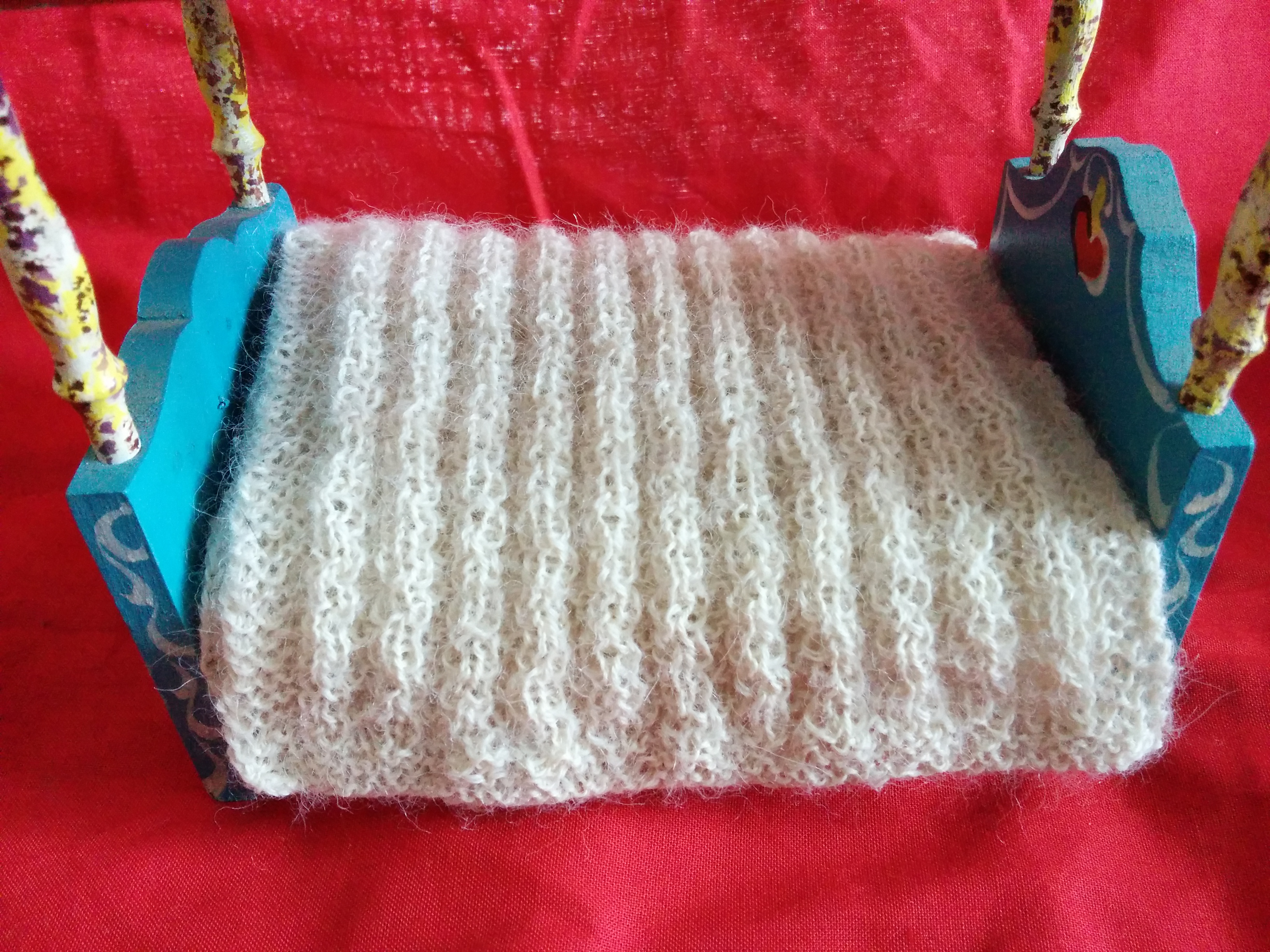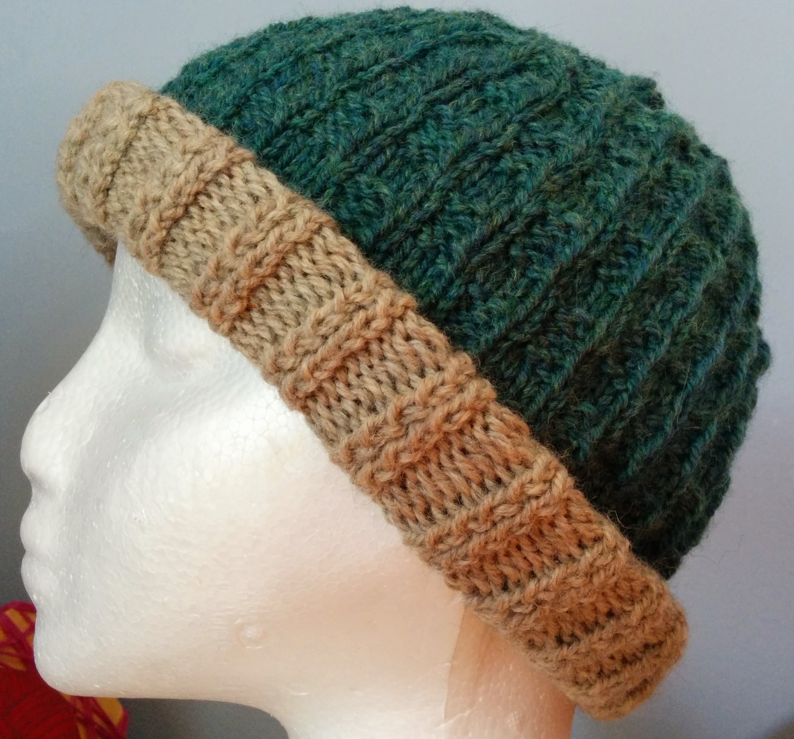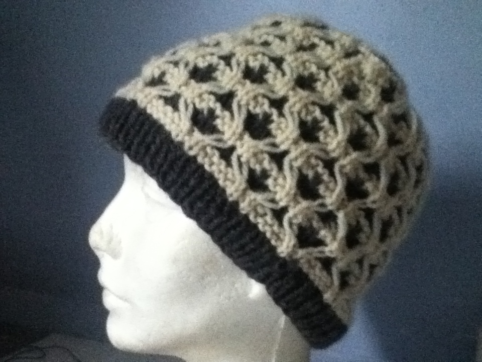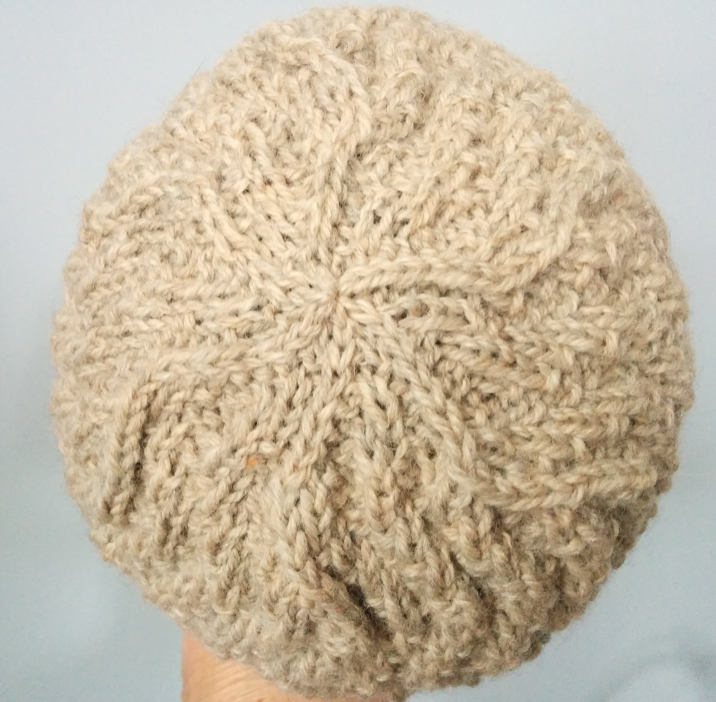 This hat incorporates Crossed Knit-Two Purl-Two Ribbing from Chapter 3, Ribbings and Waving Rib Pattern from Chapter 2, Simple Knit-Purl Combinations. She mentions that the back of the stitch is nice too, so I made the hat reversible. Here is the inside. I think I like the “inside” better, especially the top.
