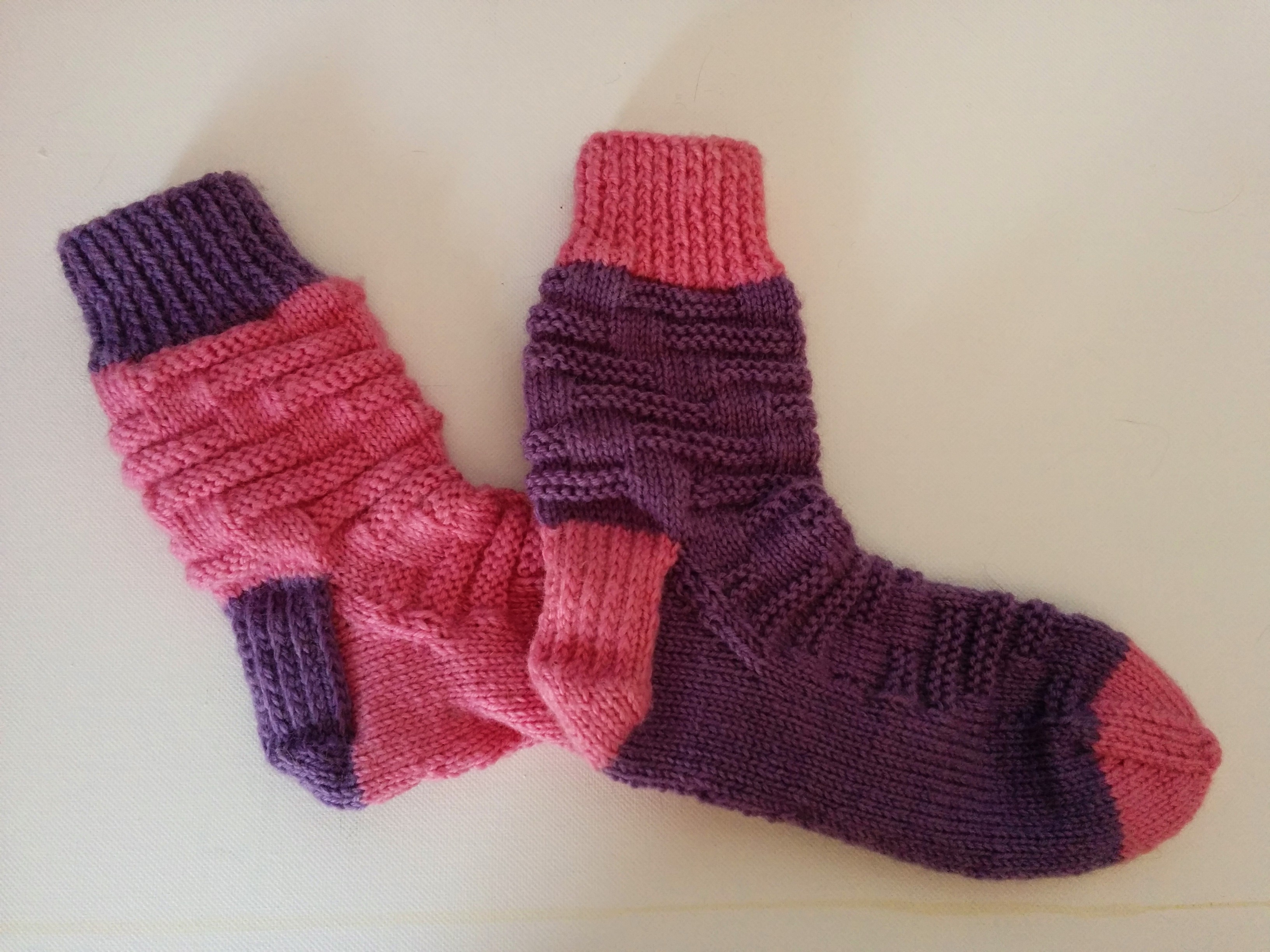 Heather and I have worn slightly different socks on each foot for a long time. If we got one of those batches of socks that had a different colour stripe, we would often wear two different colours together. She went as far as to get mad at Alan if he sorted the laundry and matched the like colours together. I understand from the talk in the change room at fitness that this is a common practice amongst “the youth”-many aquafitness participants having grandchildren. I wanted to do something like this in these socks.