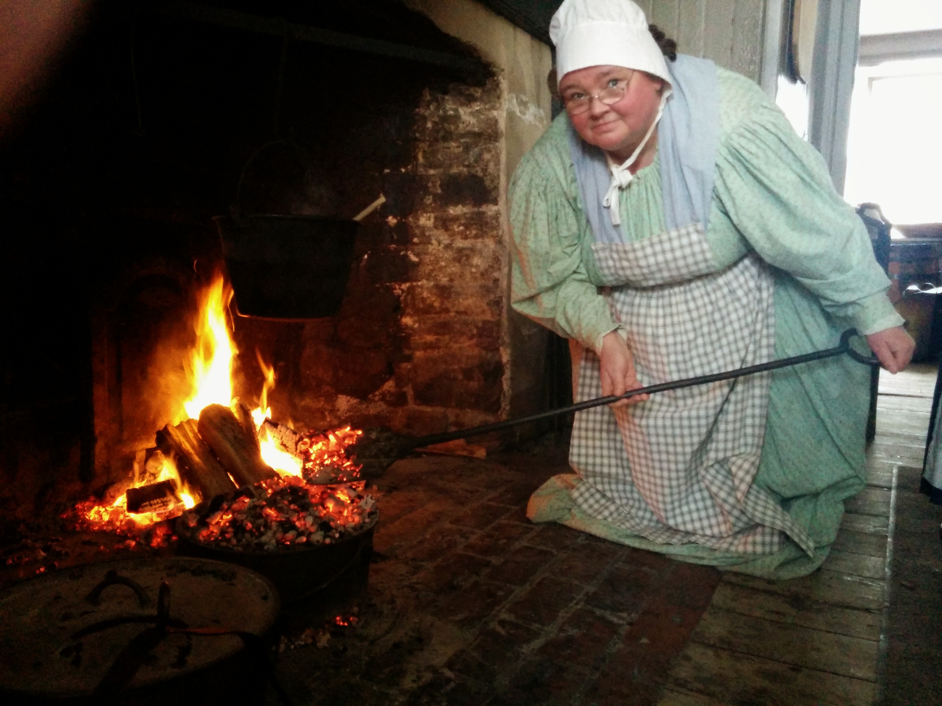 Our two main historic kitchens at the village are Loucks’ summer kitchen, with an 1800’s cookstove and the tenant farmhouse with an open hearth. Each day there is a dinner served around the noon hour in one historic kitchen. This takes place on Mondays, Wednesdays and Saturdays at the Loucks’ farm, where 6 people sit down to eat…two farmers, the cook and invited guests from around the village. On Tuesdays, Thursdays and Sundays, it is at the tenant farm with the cook, the tenant farmer and two guests eating. On Fridays, the meal takes place at Cook’s Tavern, also prepared on an open hearth. Six to eight people of the village are invited to have either soup in the cold weather or a cold bite in the warmer weather to demonstrate a tavern meal. If you are in a historic kitchen on a non meal day, you prepare an afternoon tea consisting of a historic dessert and a cup of tea. If you are preparing tea, you also make the meat and dessert for the meal the next day in your house. We arrive and set the fires at 9.30 in the morning, so preparing a full dinner from a standing start would be very challenging, and the choices quite limited. Yesterday, I prepared the meat and dessert for Sunday dinner at the tenant farm. I chose to cook a chicken in the tin reflector oven and a raisin pie in the bake kettle.