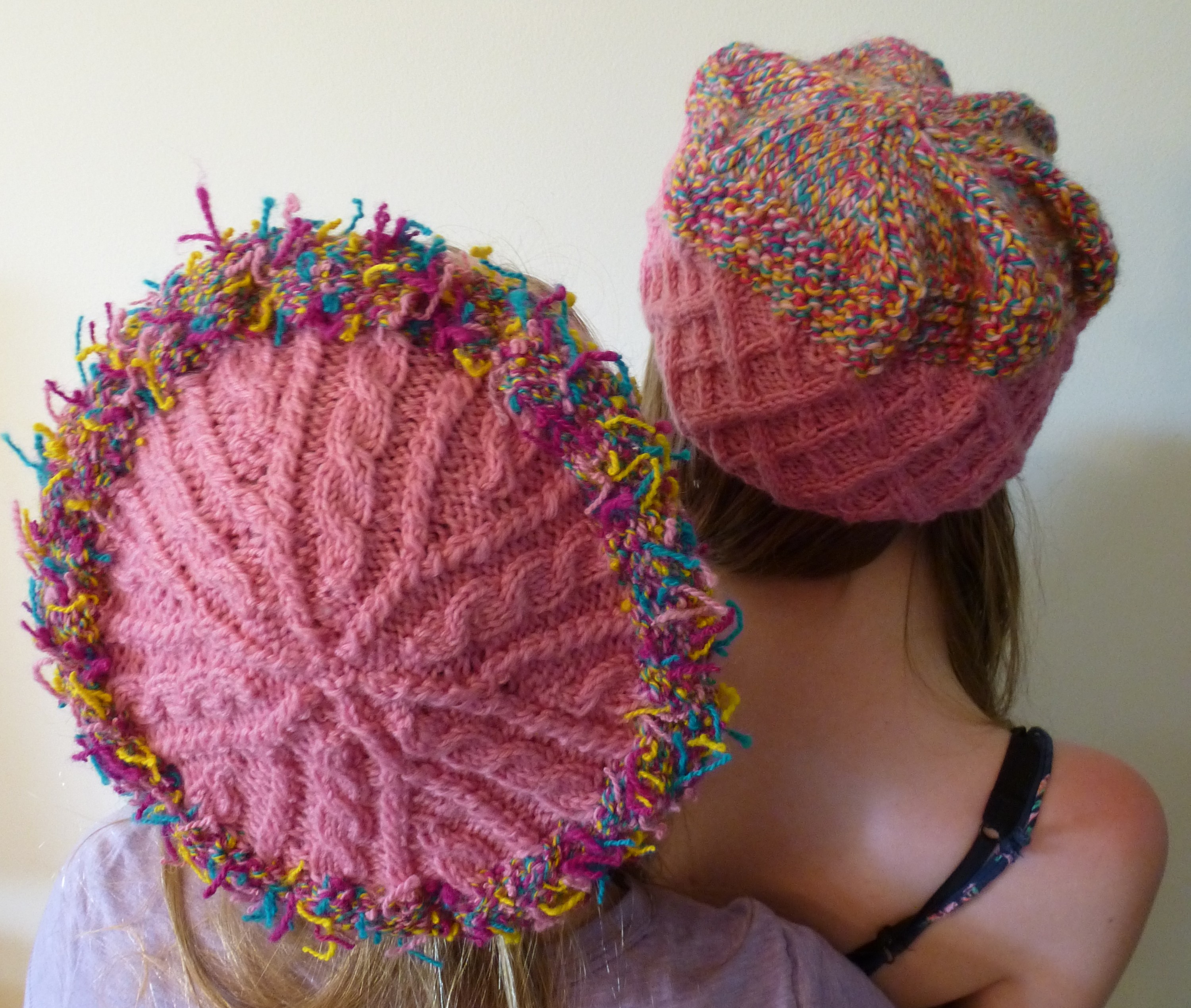 This is the hat I did this week using Slip-Stitch Honeycomb from Chapter Five, Slip-Stitch patterns and Twisted Knit-two Purl-two Ribbing from Chapter Three, Ribbings. I decreased aggressively in four places to get the pointy bits that look like an upturned Shaker Fruit Basket…see image above.
