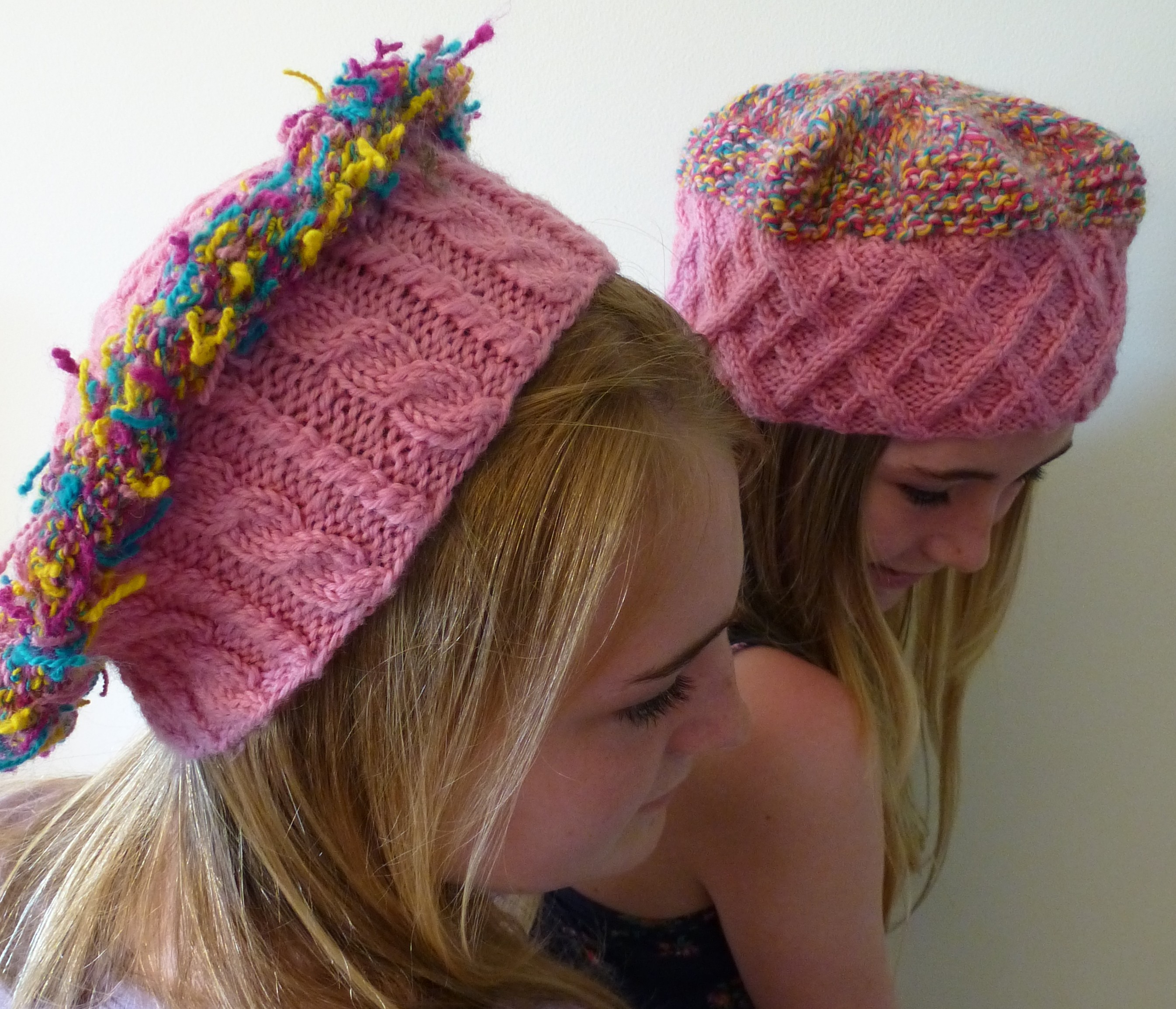 This hat and mitt set are in a style I had been working on quite a bit earlier this year. I use random balls of novelty yarn from the discount bins and combine them with plain worsted weight yarn. I usually enclose the back of the novelty yarn with regular worsted yarn, because a lot of them are on the scratchy side, which is probably why they end up in the discount bins in the first place. For the Easter theme, I used a novelty yarn that had Easter Colours in it.